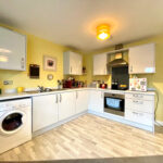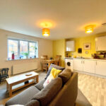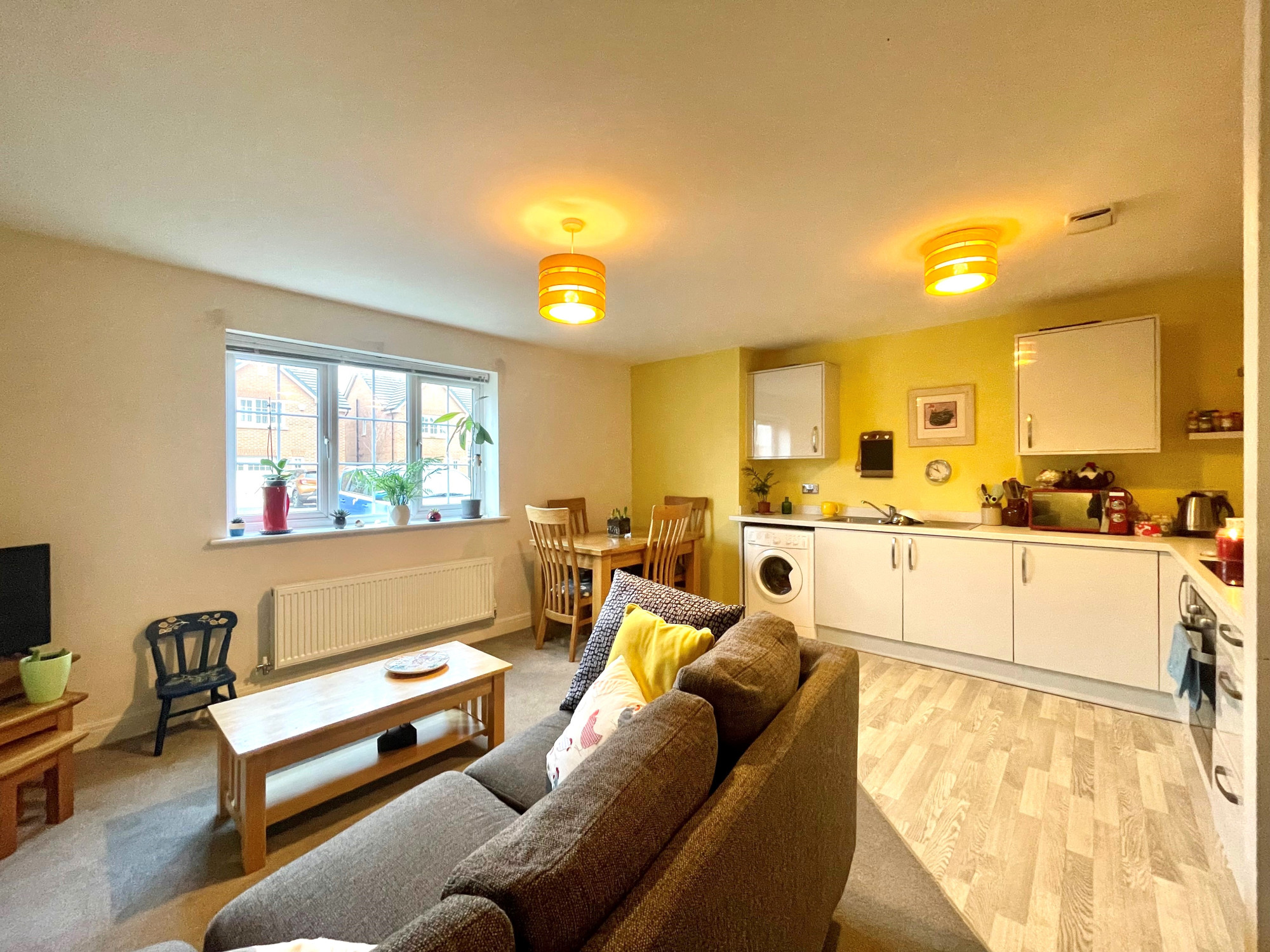 The open plan kitchen and and living area features plenty of base and wall storage units with built in appliances and sink with drainer. The living area is a generous size and can comfortably fit a dining table.