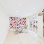 At the heart of the home lies the open-plan kitchen and dining area, thoughtfully designed to bring family life and entertaining together. The kitchen is well appointed with an integrated oven and dishwasher, complemented by generous granite work surfaces and plentiful storage. The dining area comfortably accommodates a large table, making it ideal for everyday family meals as well as larger gatherings with friends and family.