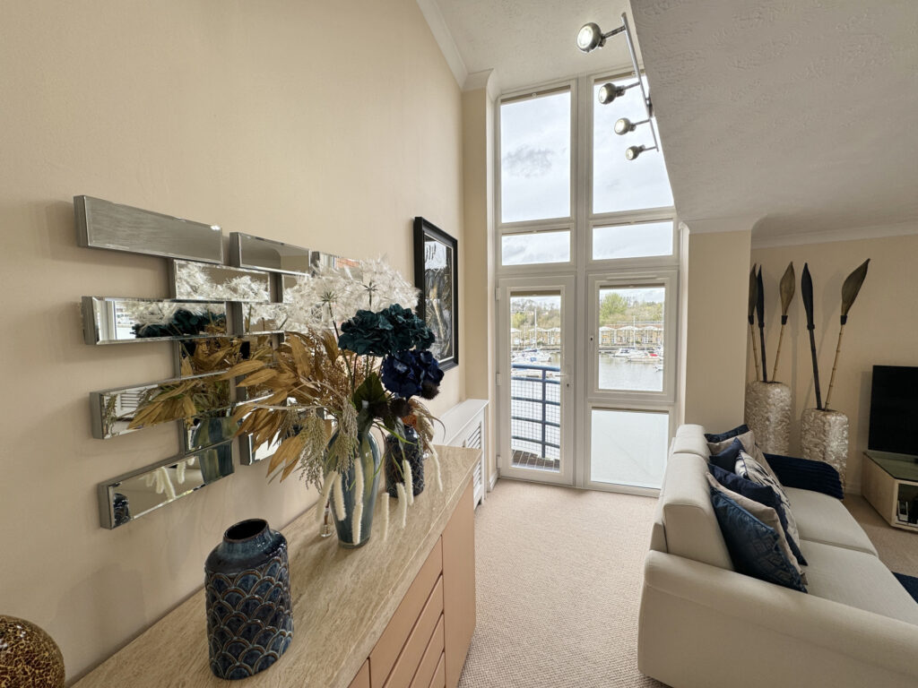 Ascend to the upper floor and discover a realm of luxury that continues to captivate. A versatile landing area offers the perfect space for a home office, while a beautifully appointed kitchen and dining room provide the ideal setting for culinary delights and entertaining. The pièce de résistance undoubtedly lies in the expansive living/dining room, where luxury takes center stage. With its open, vaulted ceiling and floor-to-ceiling glazing, this space exudes elegance and sophistication. Step outside onto the feature balcony or French doors leading to the enchanting roof terrace, where you can unwind and soak in the panoramic views of the Marina and beyond.