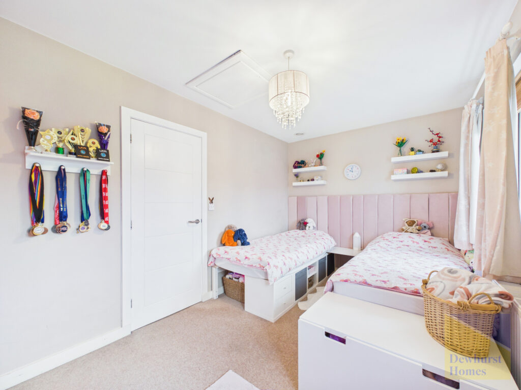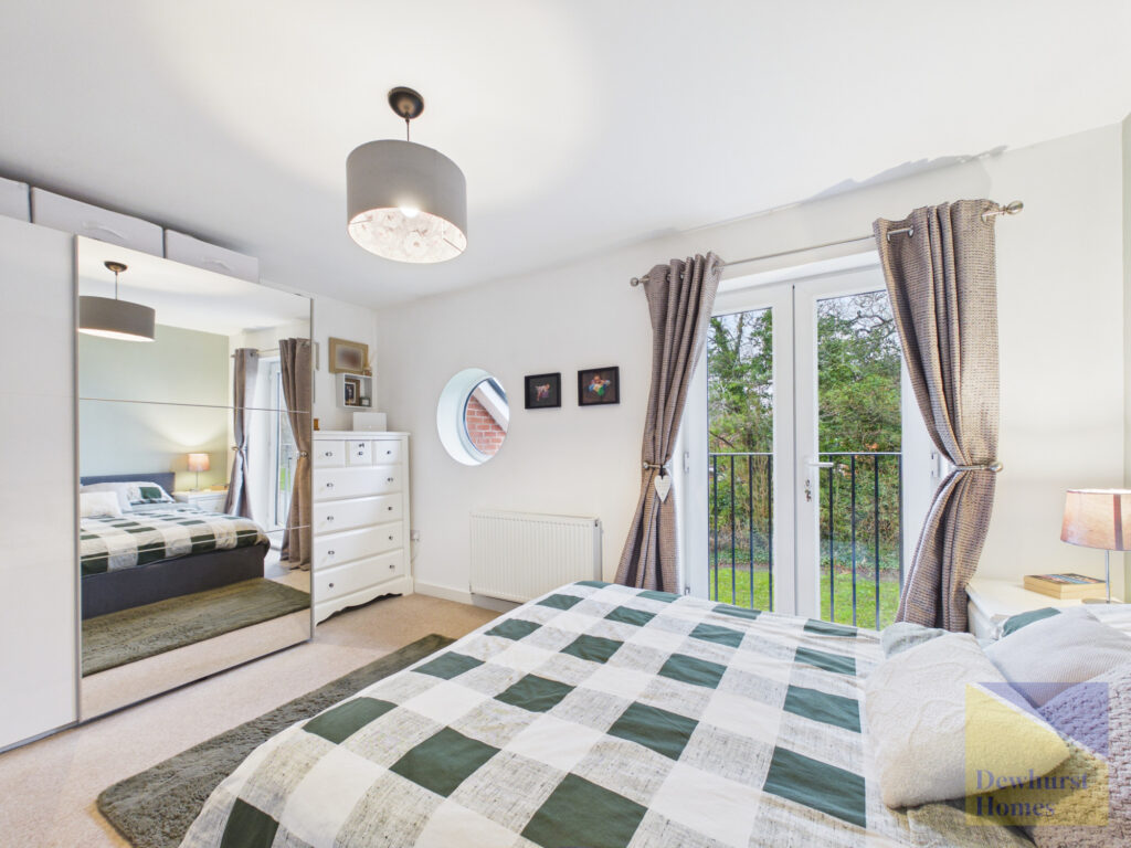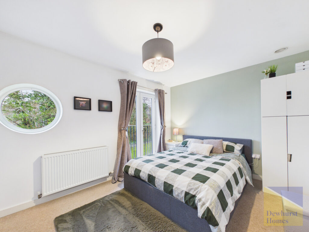 To the first floor, there are two well-proportioned double bedrooms. The principal bedroom enjoys a distinctive portal-style window to the front along with French doors opening to a Juliet balcony, creating a light and airy feel. The second double bedroom overlooks the rear garden. The family bathroom is fitted with a modern three-piece suite comprising a panelled bath with shower over, wash hand basin and WC.