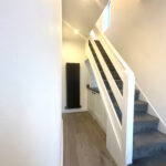 Composite front door with frosted glass panels and matching frosted side window. Features Karndean flooring, meter cupboard, coat hanging space, single panel radiator, and staircase to the first floor with useful under-stairs storage.