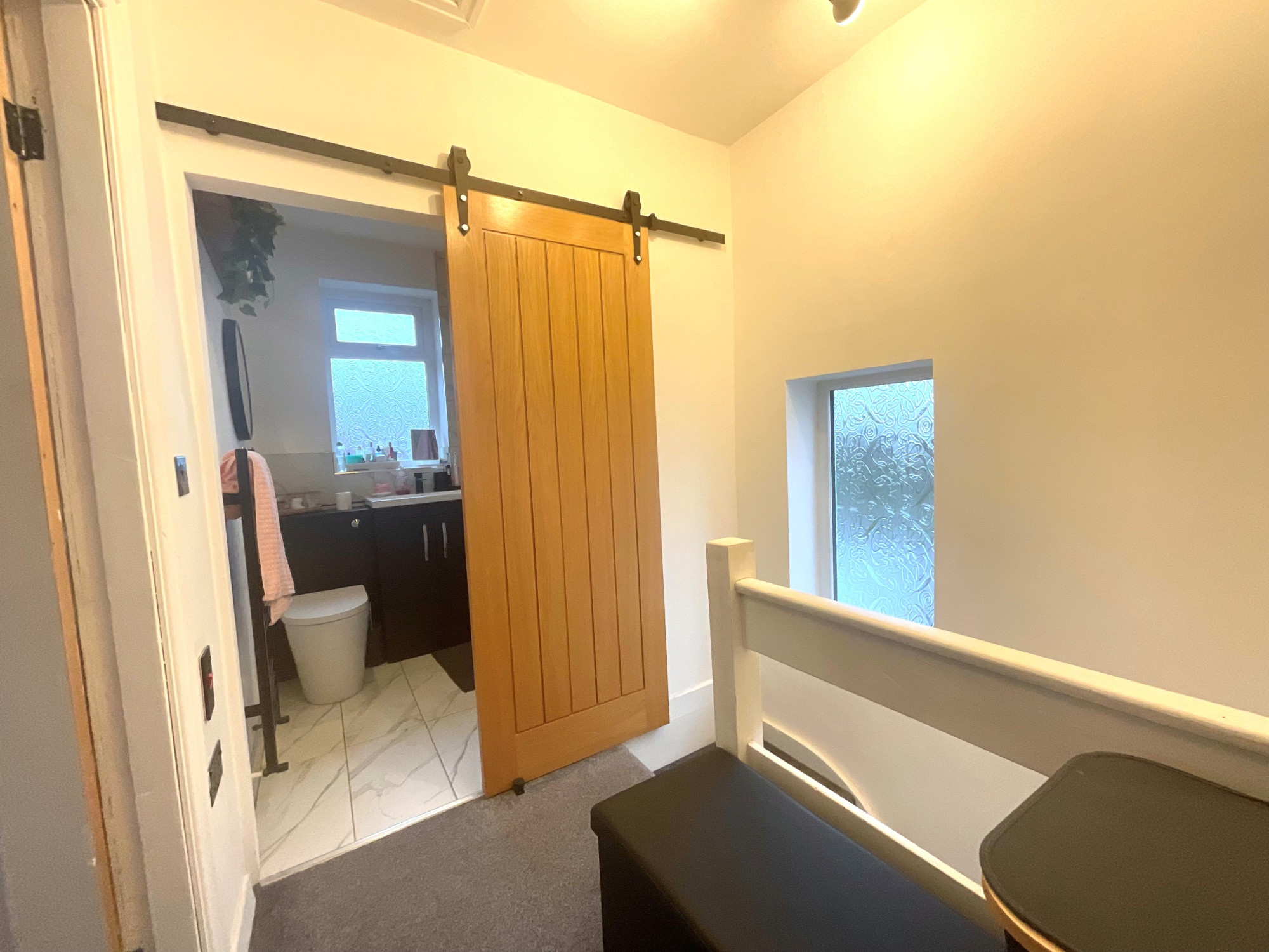 UPVC double glazed frosted side window, carpeted flooring, smoke alarm, and loft access.