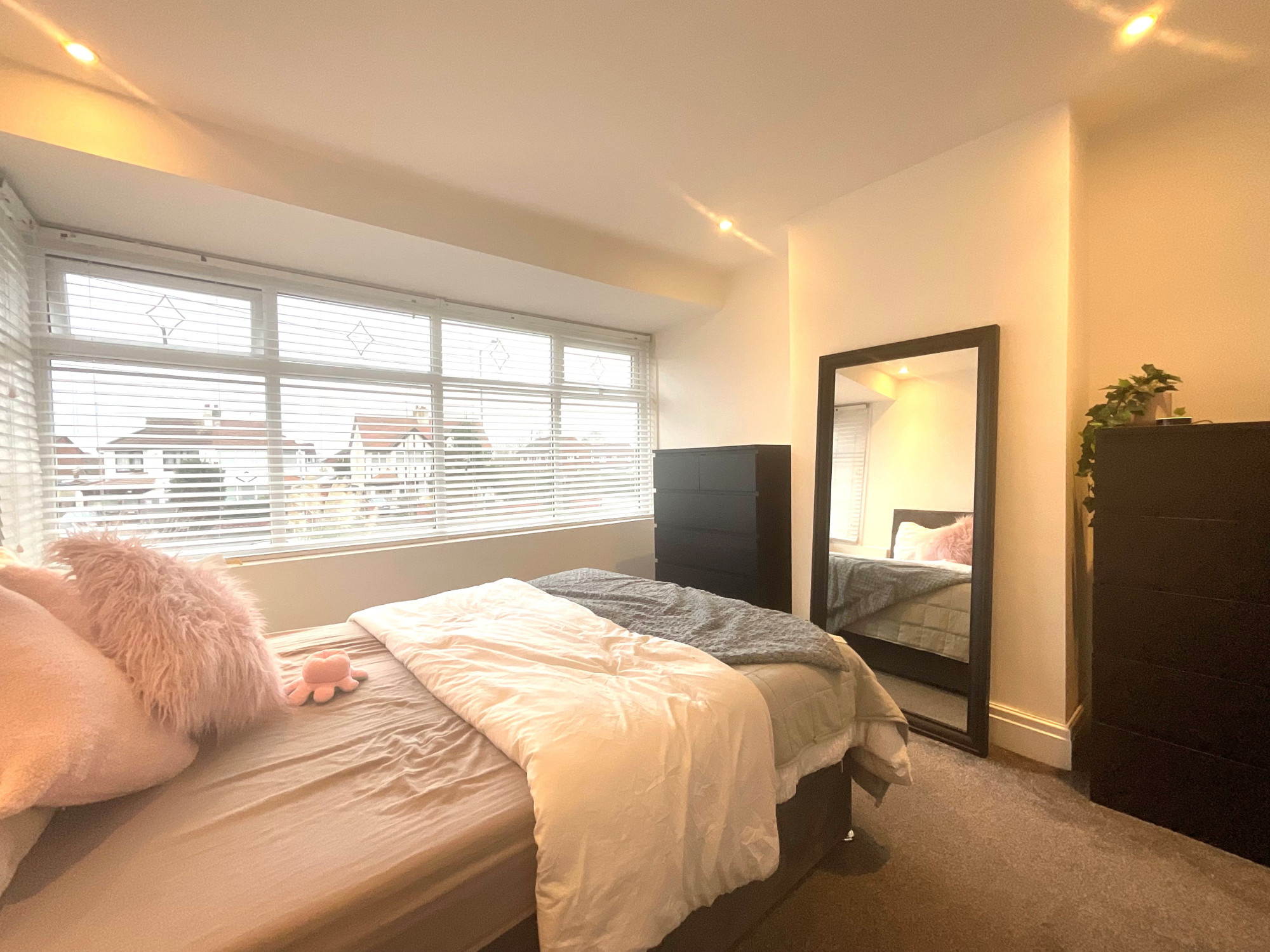 Spacious double bedroom with UPVC double glazed bay window to the front, carpet flooring, double panel radiator, and TV point.