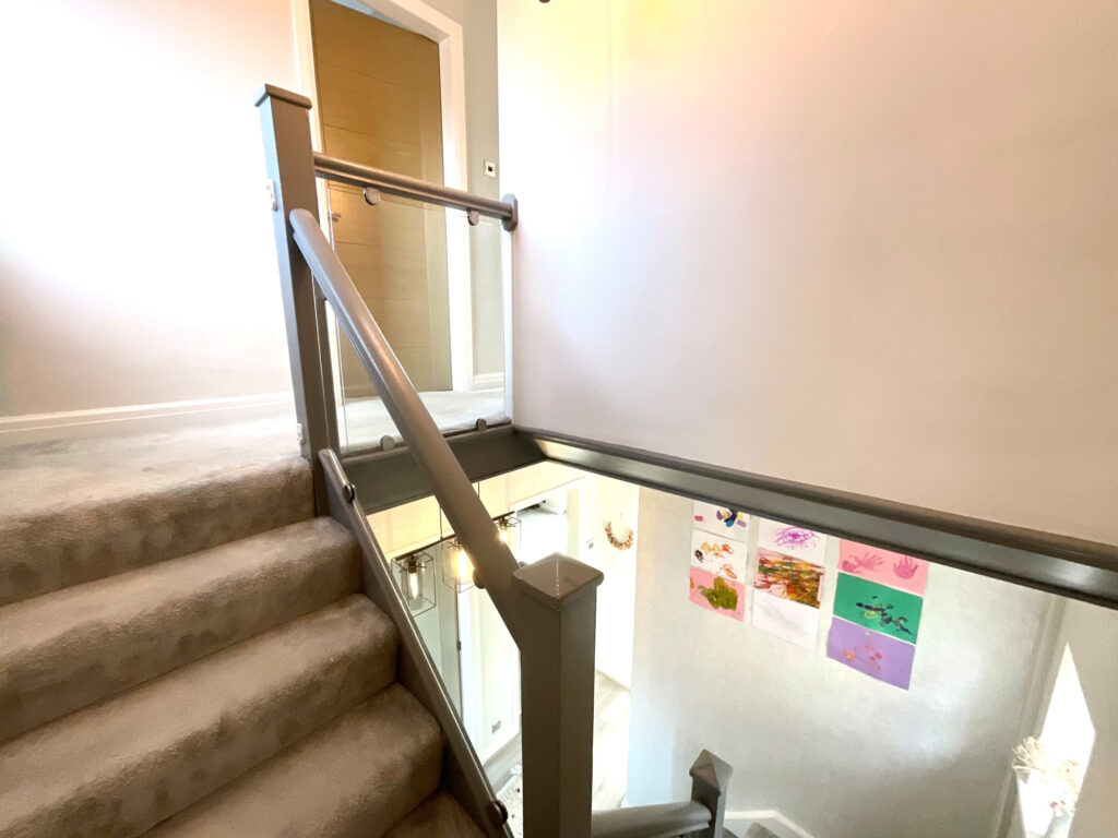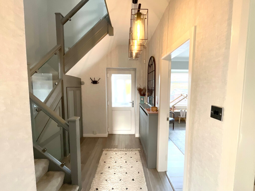 A welcoming vestibule opens into a bright and contemporary hallway featuring underfloor heating and a sleek glass balustrade staircase with built-in under-stairs storage.