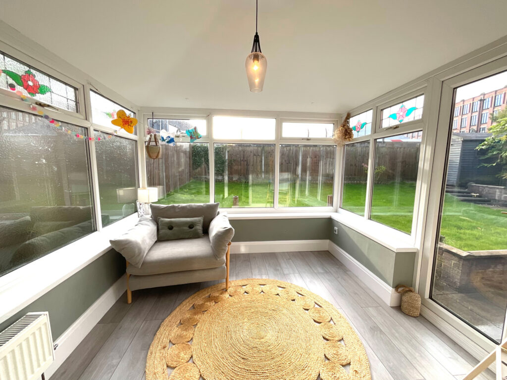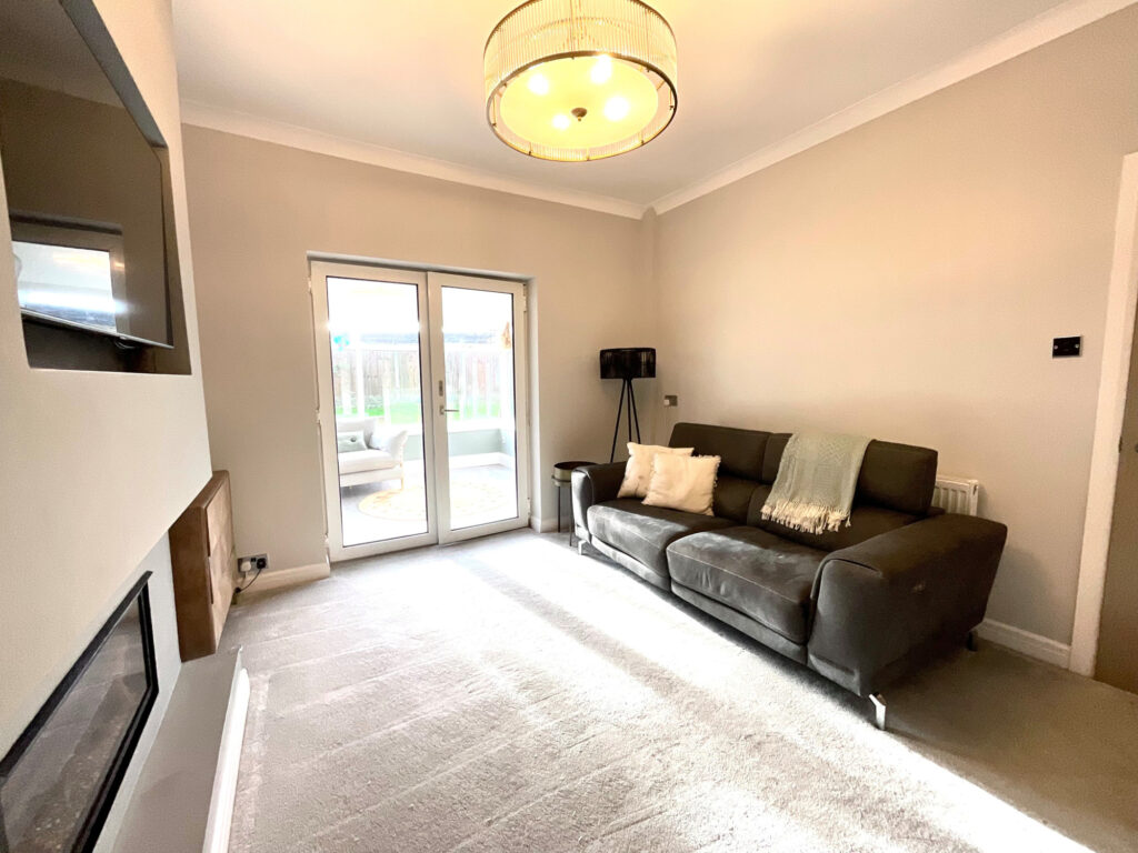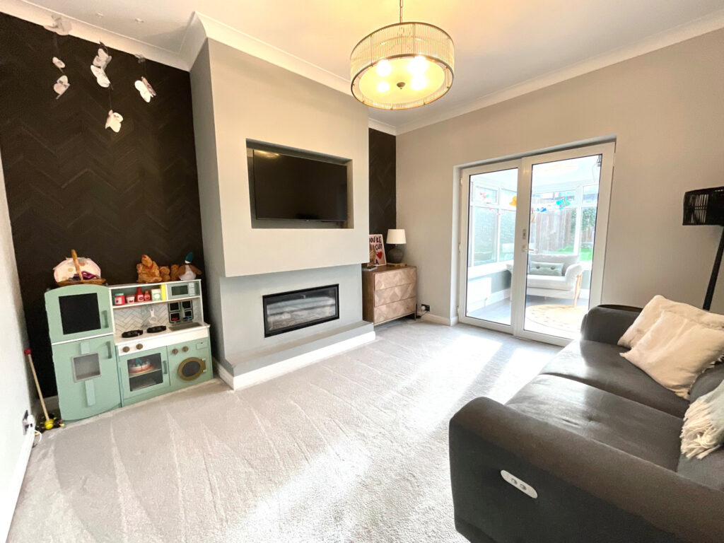 The second reception room provides a sophisticated setting with plush grey carpets, a stylish media wall, and a gas fire. Patio doors lead through to the conservatory, filling the space with natural light and providing seamless access to the garden.