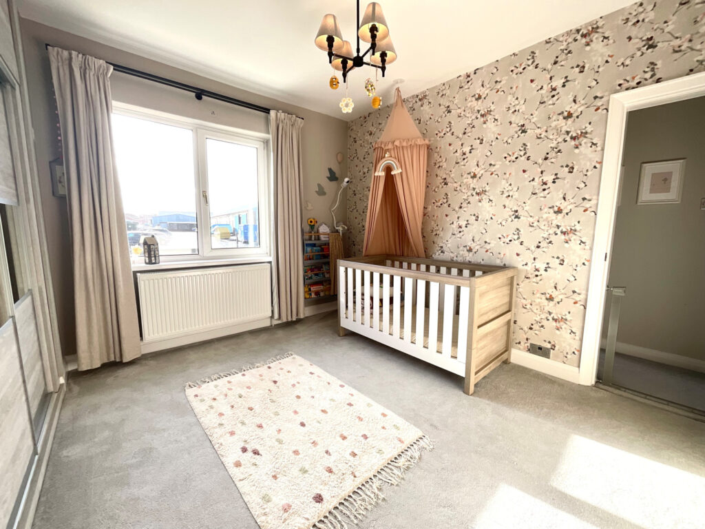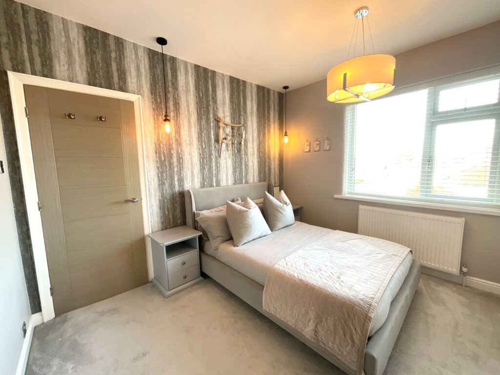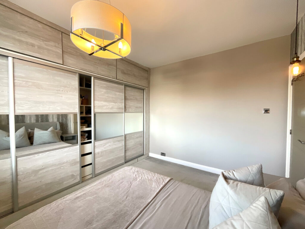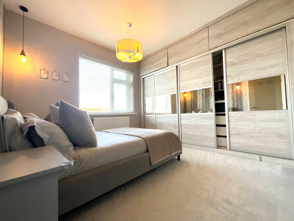Upstairs, the main bedroom is a generous double with fitted wardrobes and modern décor.