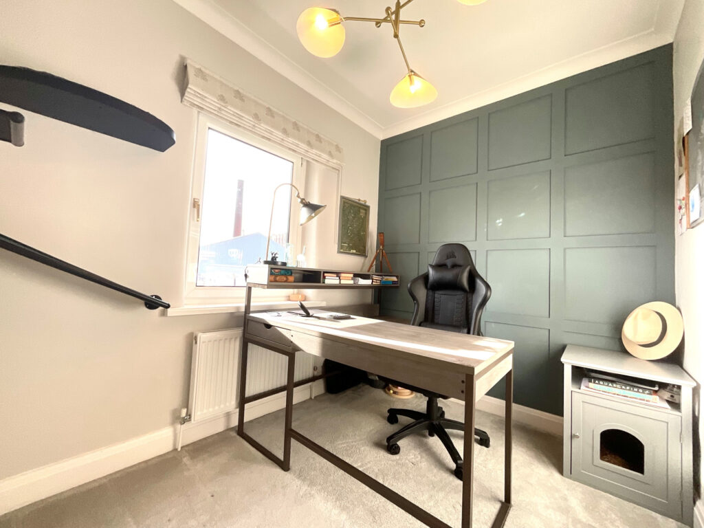 The third bedroom is a generous single, currently used as a study/office, complete with feature wall panels, making it ideal for home working or as a versatile guest room.