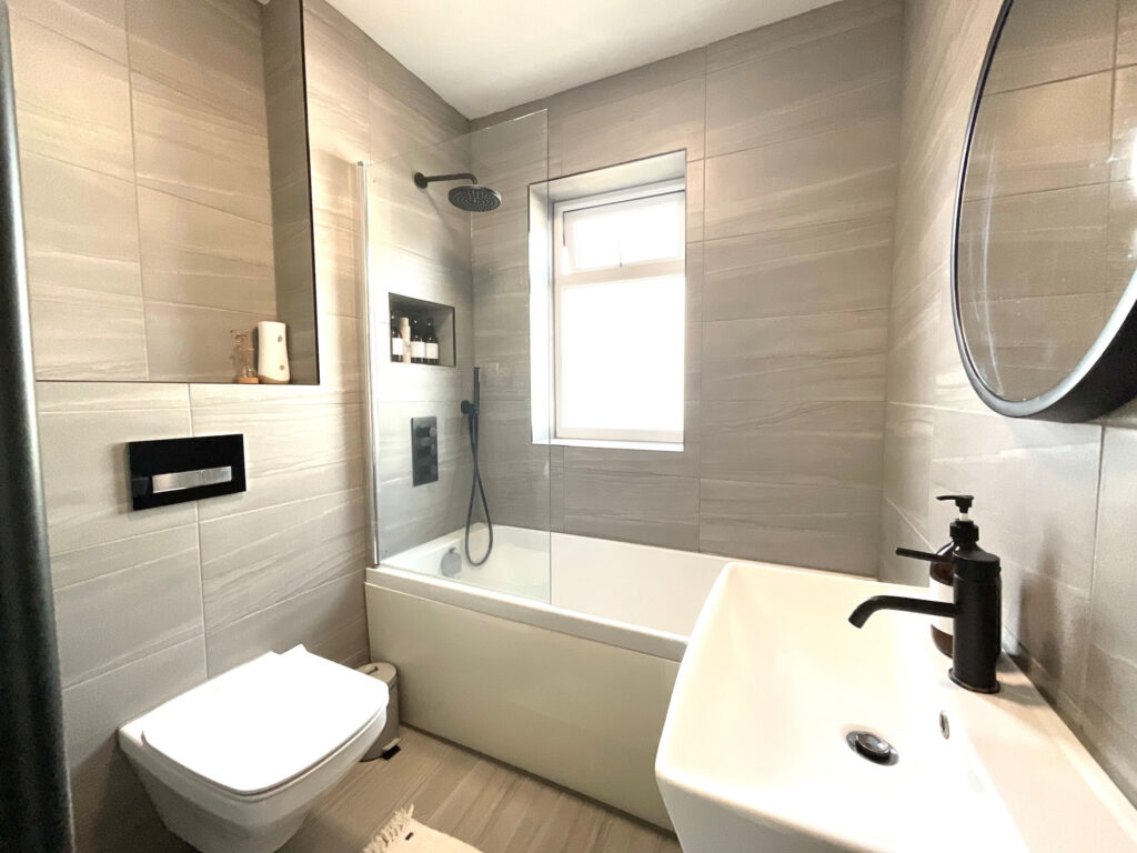 The family bathroom exudes contemporary style, with full tiling, matt black fixtures and fittings, and a high-quality finish throughout.