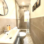 The modern shower room is beautifully fitted, featuring a stylish vanity unit, double shower enclosure with waterfall showerhead and handheld attachment, providing a luxurious finish.