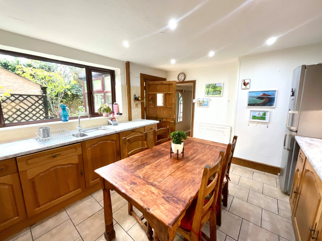 At the heart of the home lies a superb kitchen and dining space. Designed for both practicality and style, it features contemporary appliances, excellent storage solutions. The kitchen/dining area comfortably accommodates a family table, creating an inviting setting for gatherings.