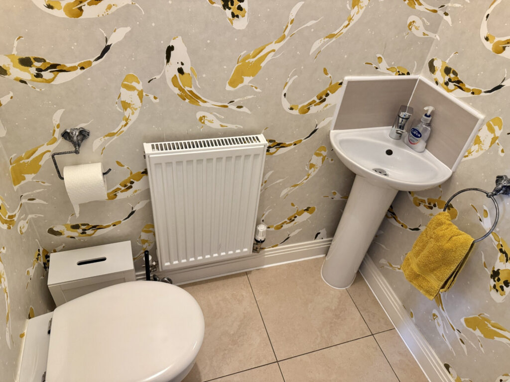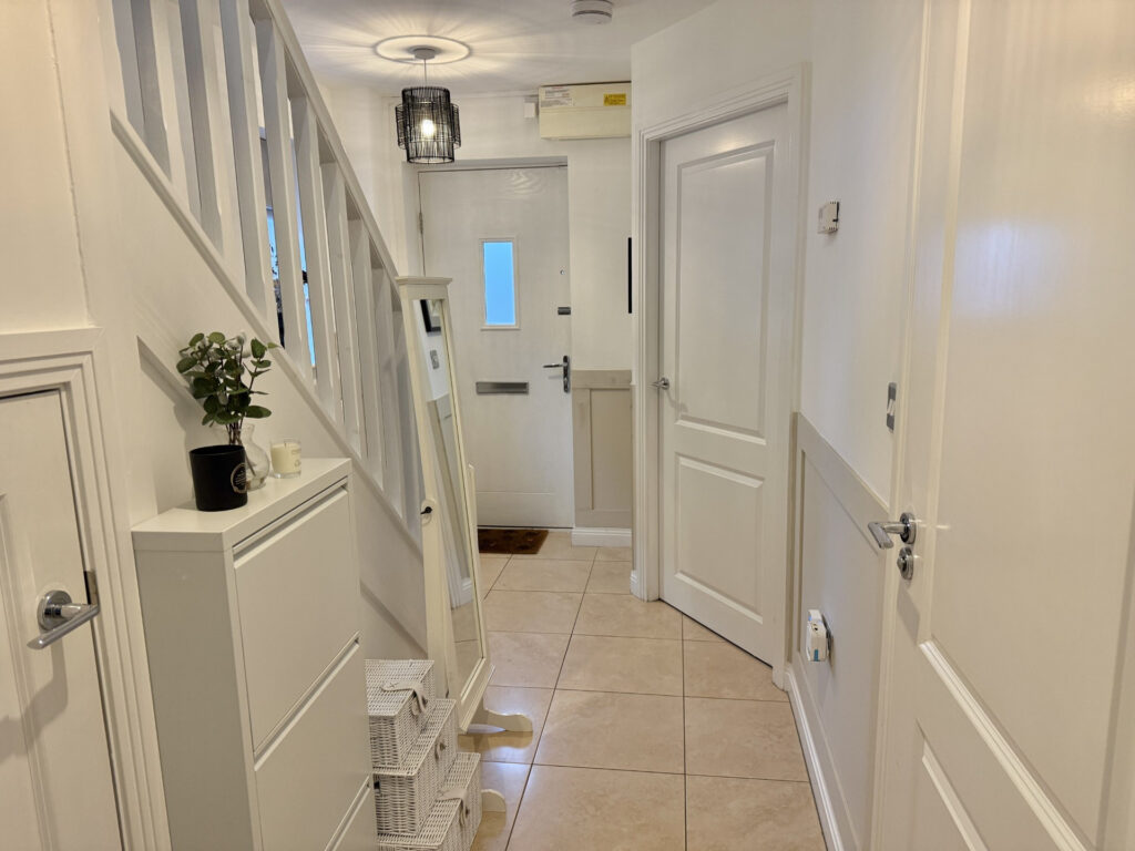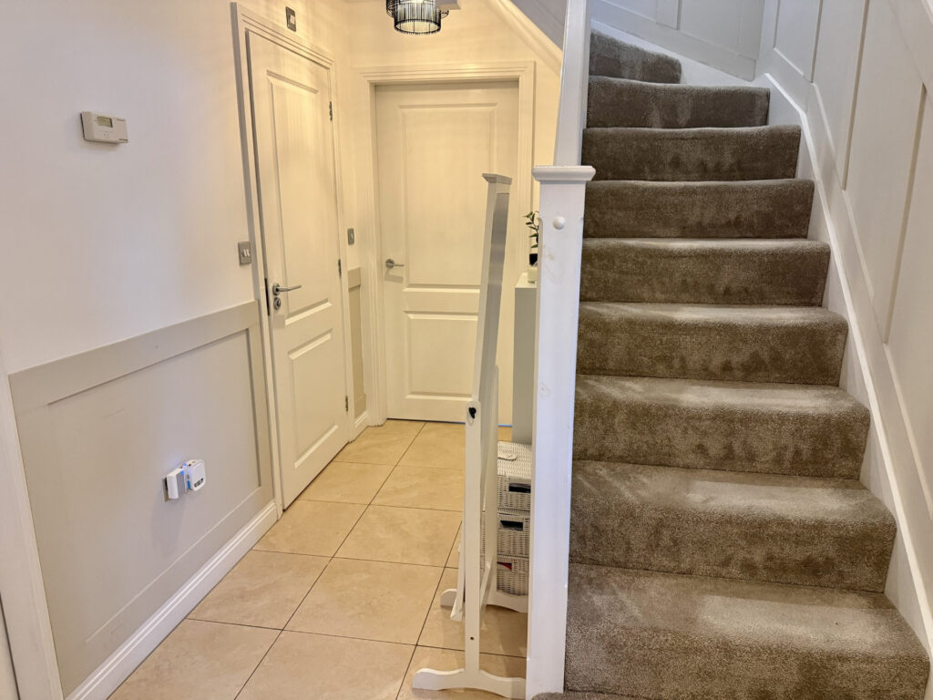 The ground floor is further enhanced by a welcoming, fully tiled hallway with storage cupboard and a convenient cloakroom.