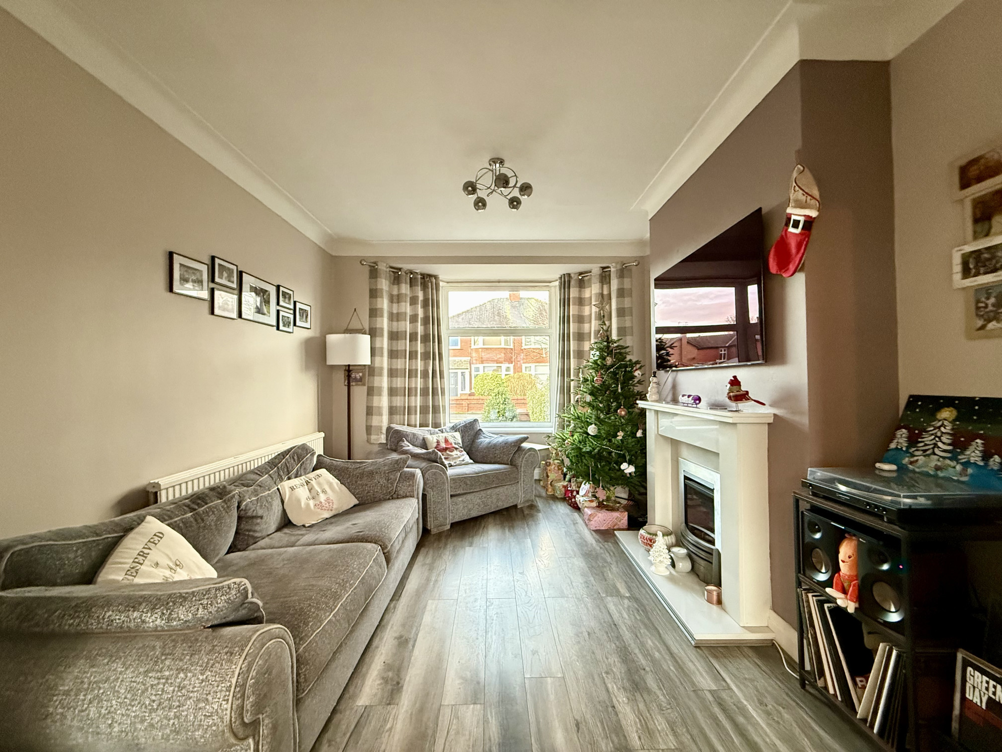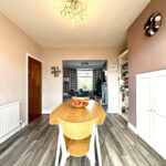 Enter through the convenient porch into a welcoming hallway, from which all ground-floor rooms are accessible. An open spindle staircase rises to the first floor. At the front, the lounge features a bay window and a feature fireplace and opens seamlessly into the dining room. Patio doors overlook the rear garden, bringing in light and providing easy outdoor access. The kitchen is fitted with a range of wall and base units, with contrasting worktops and splash backs, a sink and drainer with mixer tap, and integrated appliances. A handy under-stairs cupboard provides storage. The ground floor also provides access to a rear porch and the garage.