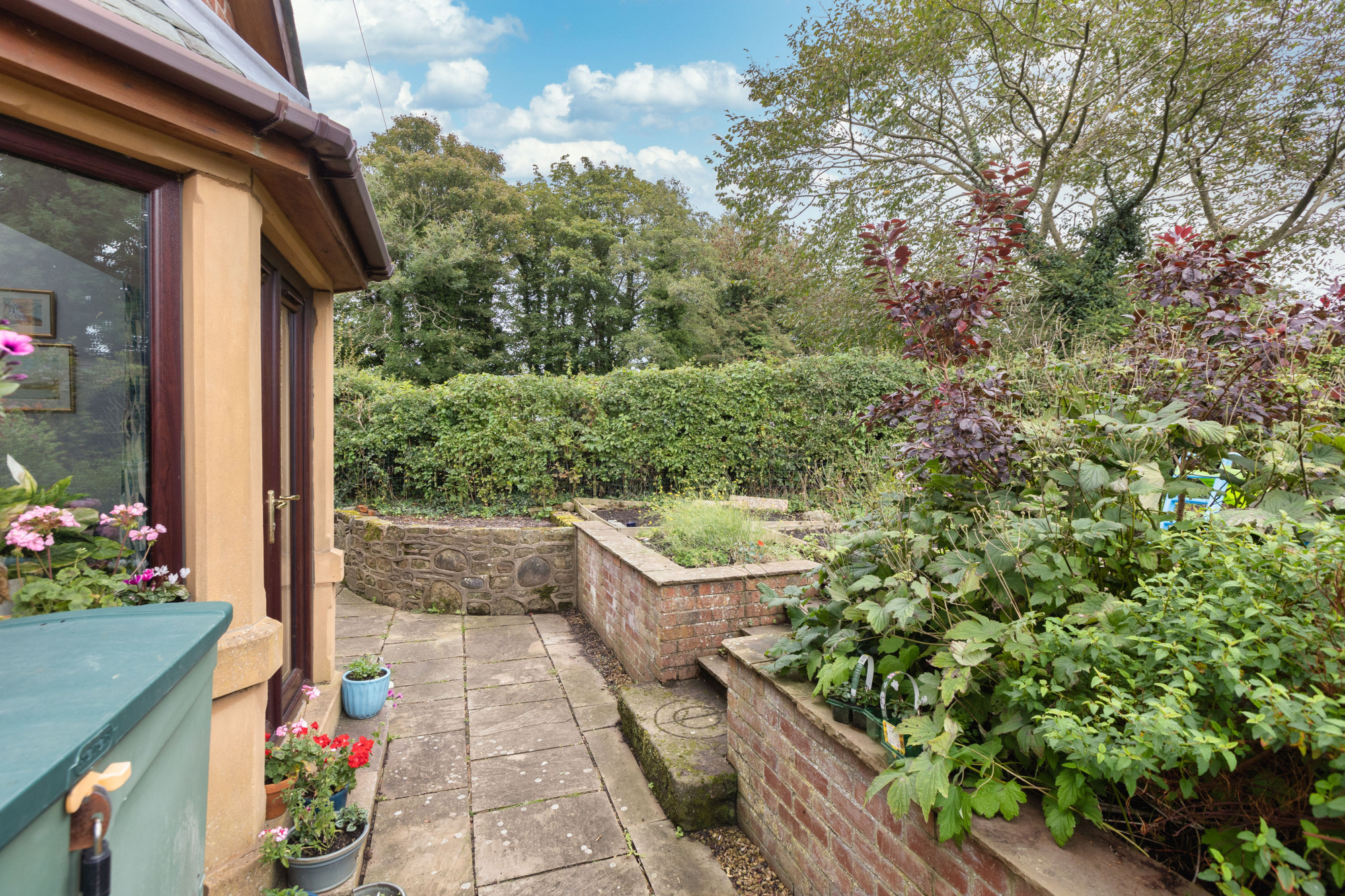 Externally the beautifully landscaped gardens are private and secure. The paved driveway can accommodate several cars, the elevated side garden is picture perfect for relaxing or socialising with family and friends. Established plants, shrubs, trees and vegetable, herb and strawberry patches, paved patio with steps up to the garden incorporating an original stone cheese press. Views of the fields,Β canal and beyond areΒ huddled together with the sound of nature, peace and tranquility.