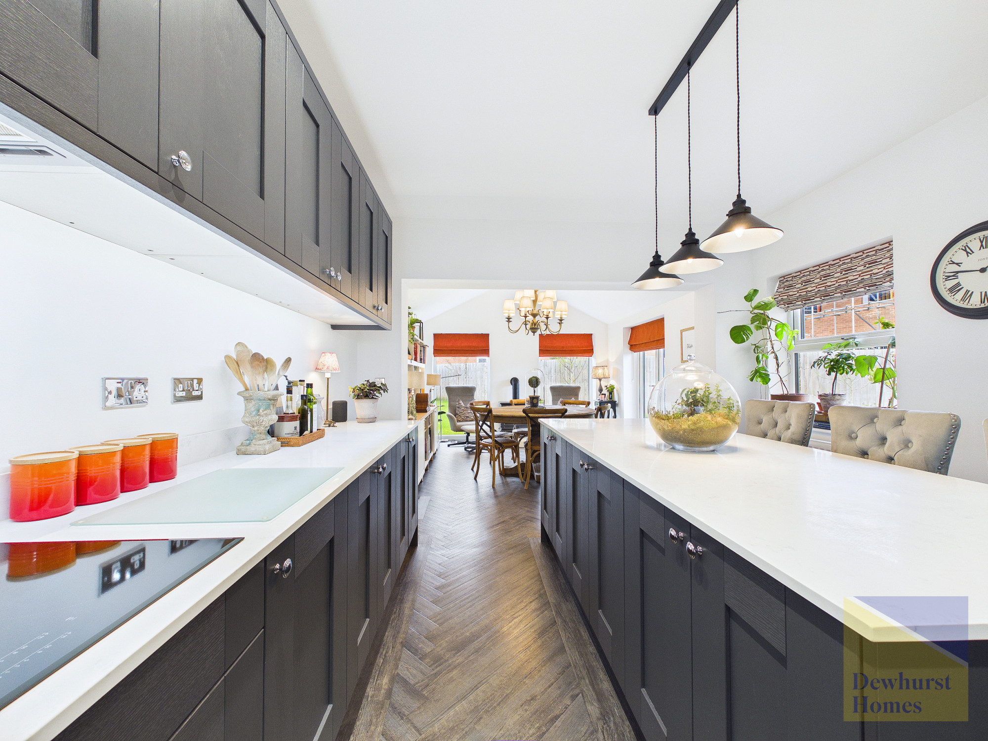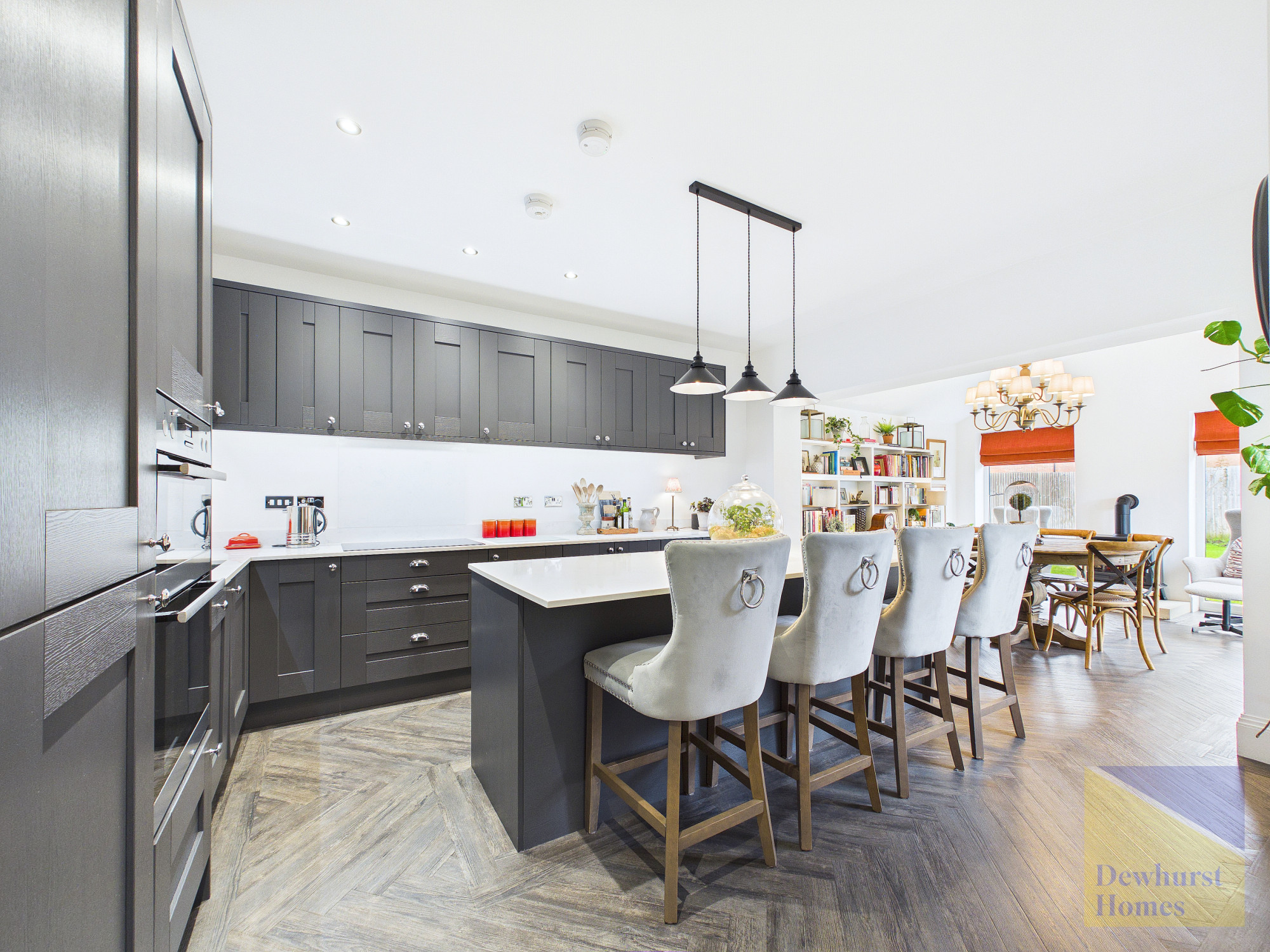 The standout feature is the extended open-plan kitchen, dining and family area with high-spec AEG appliances, a large island, and vaulted ceiling. Additional accommodation includes a lounge, home office, utility room, and downstairs WC.
