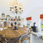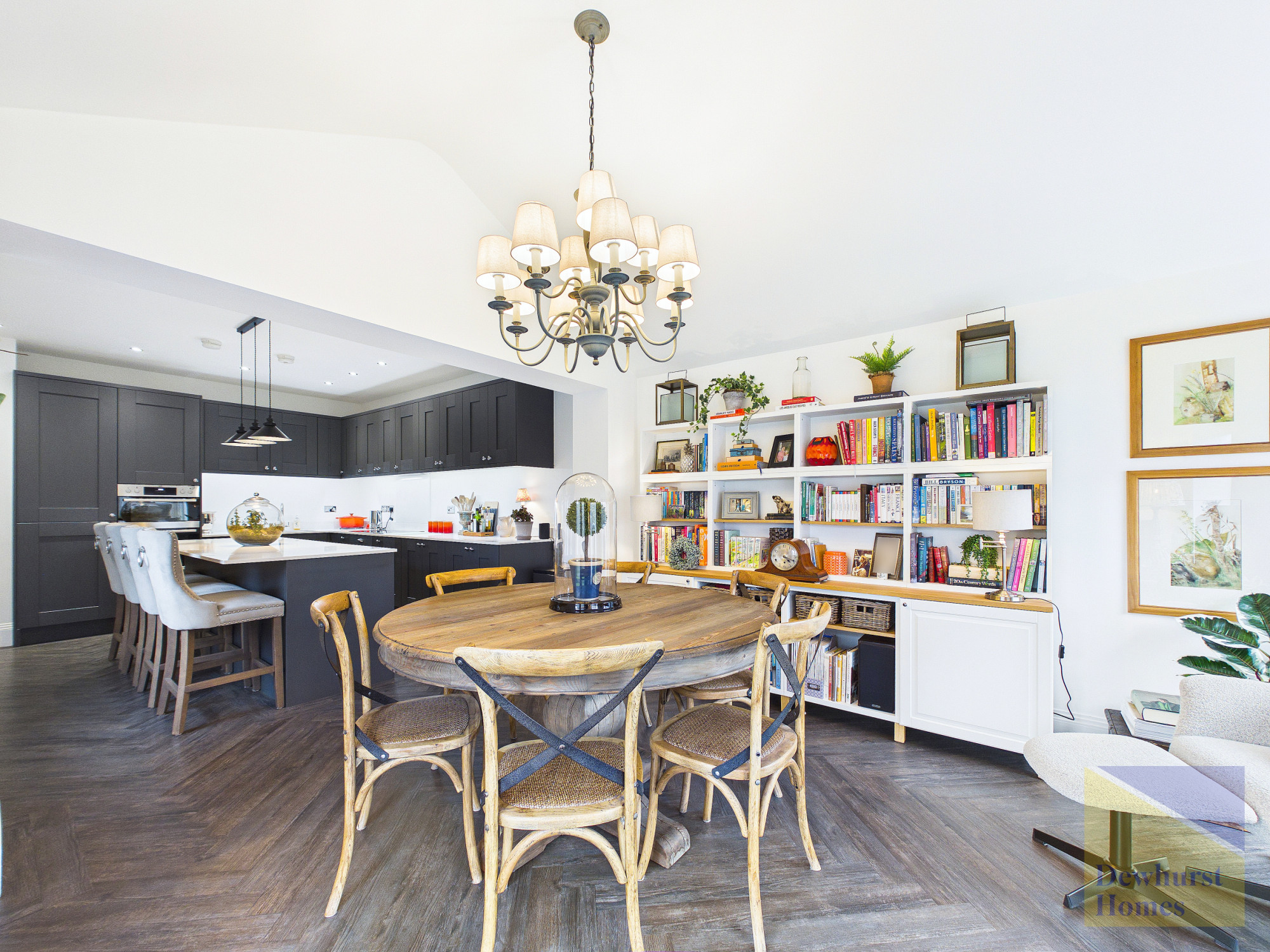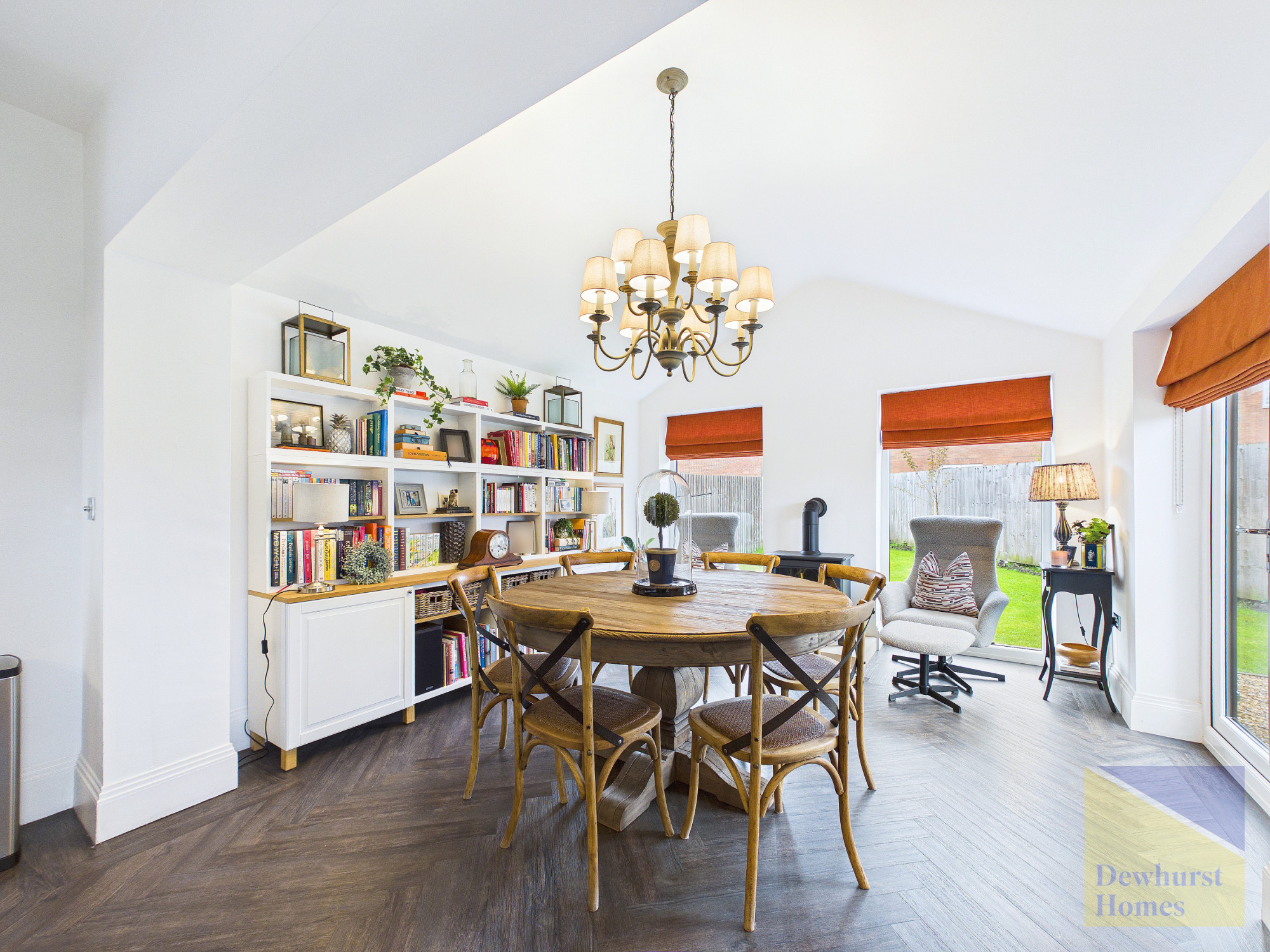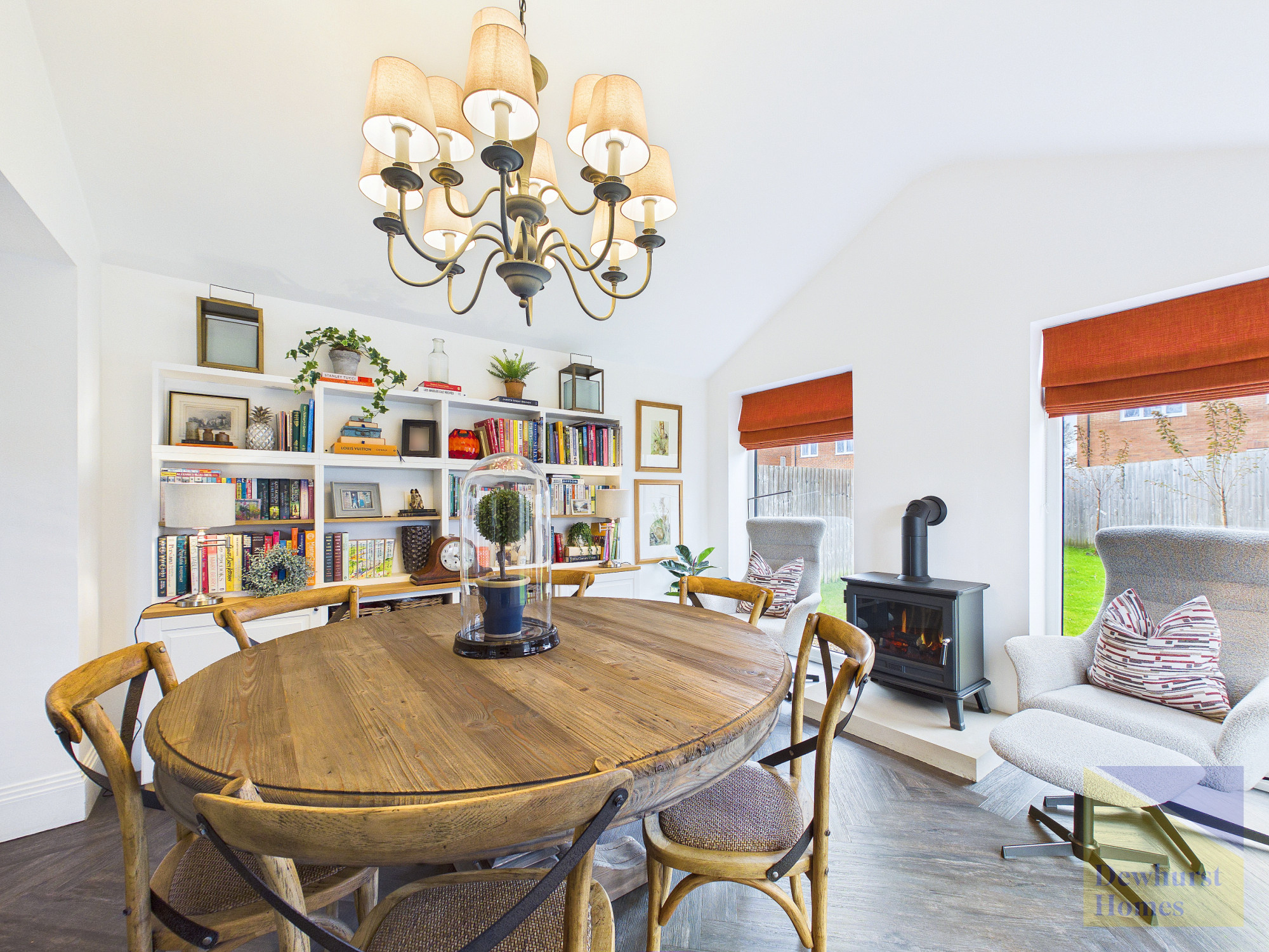 The true heart of the home is the outstanding extended kitchen, dining and family area, thoughtfully designed for both everyday living and entertaining. The kitchen is fitted with an extensive range of charcoal grey shaker-style units, complemented by premium stone worktops and a large central island with seating. High-specification AEG integrated appliances include an induction hob, double oven, fridge freezer, and dishwasher, ensuring both practicality and style. The open-plan layout flows seamlessly into a stunning dining and family space, featuring a vaulted ceiling, large windows overlooking the garden, patio doors providing direct outdoor access, and a feature electric log burner, creating a warm and sociable environment.