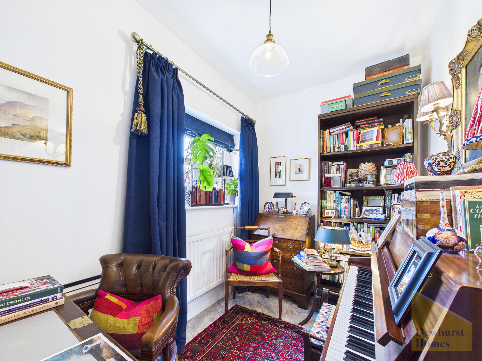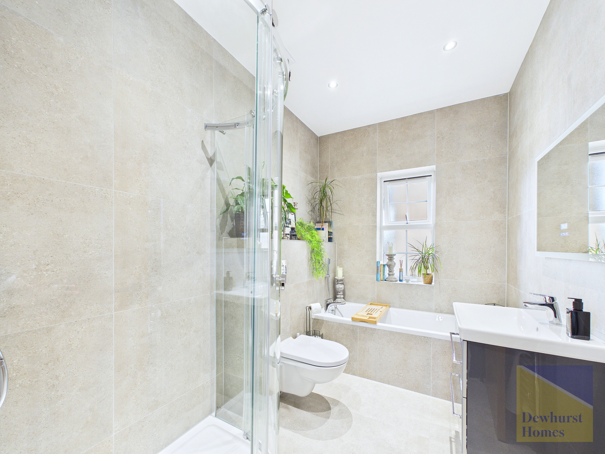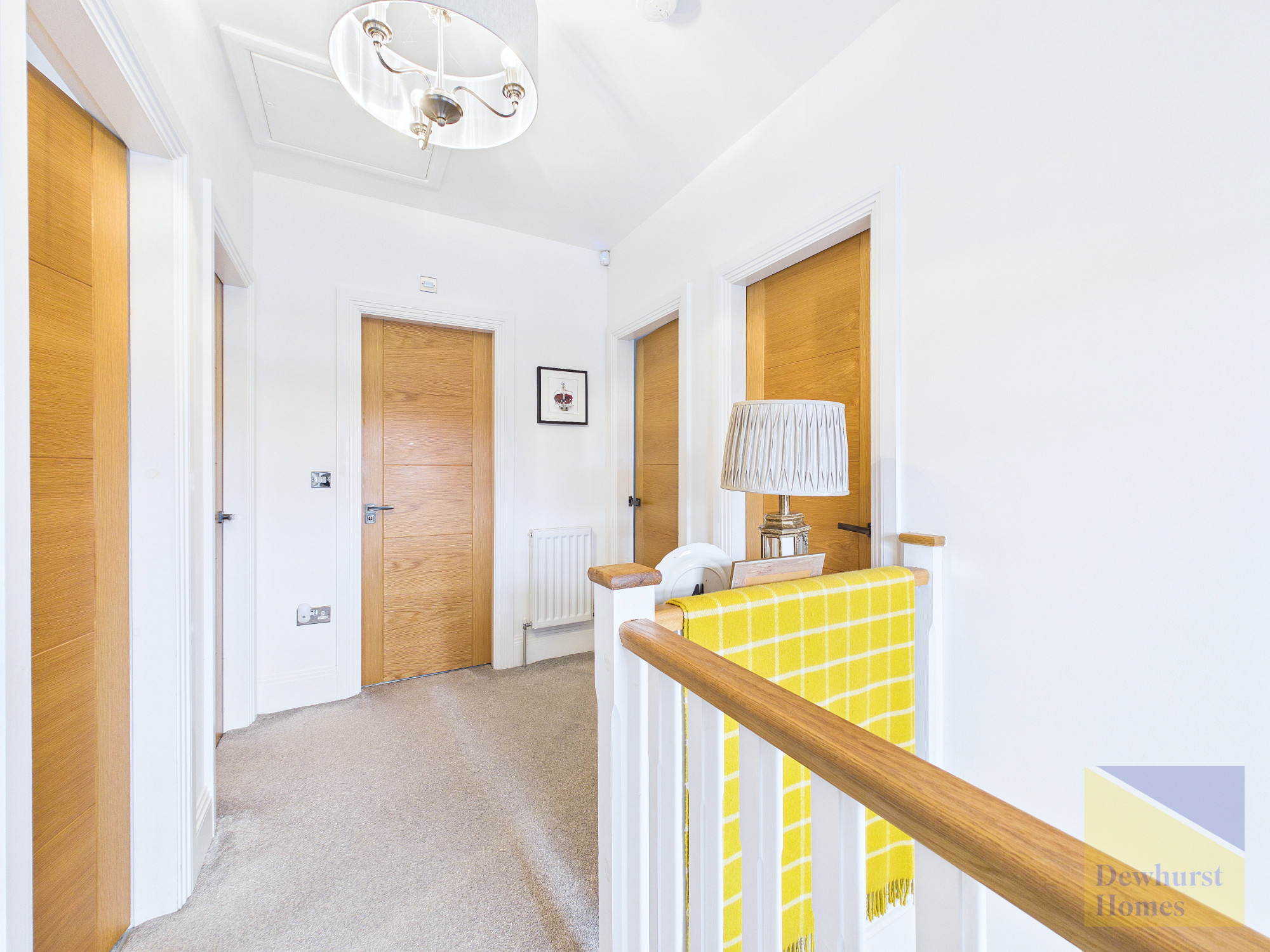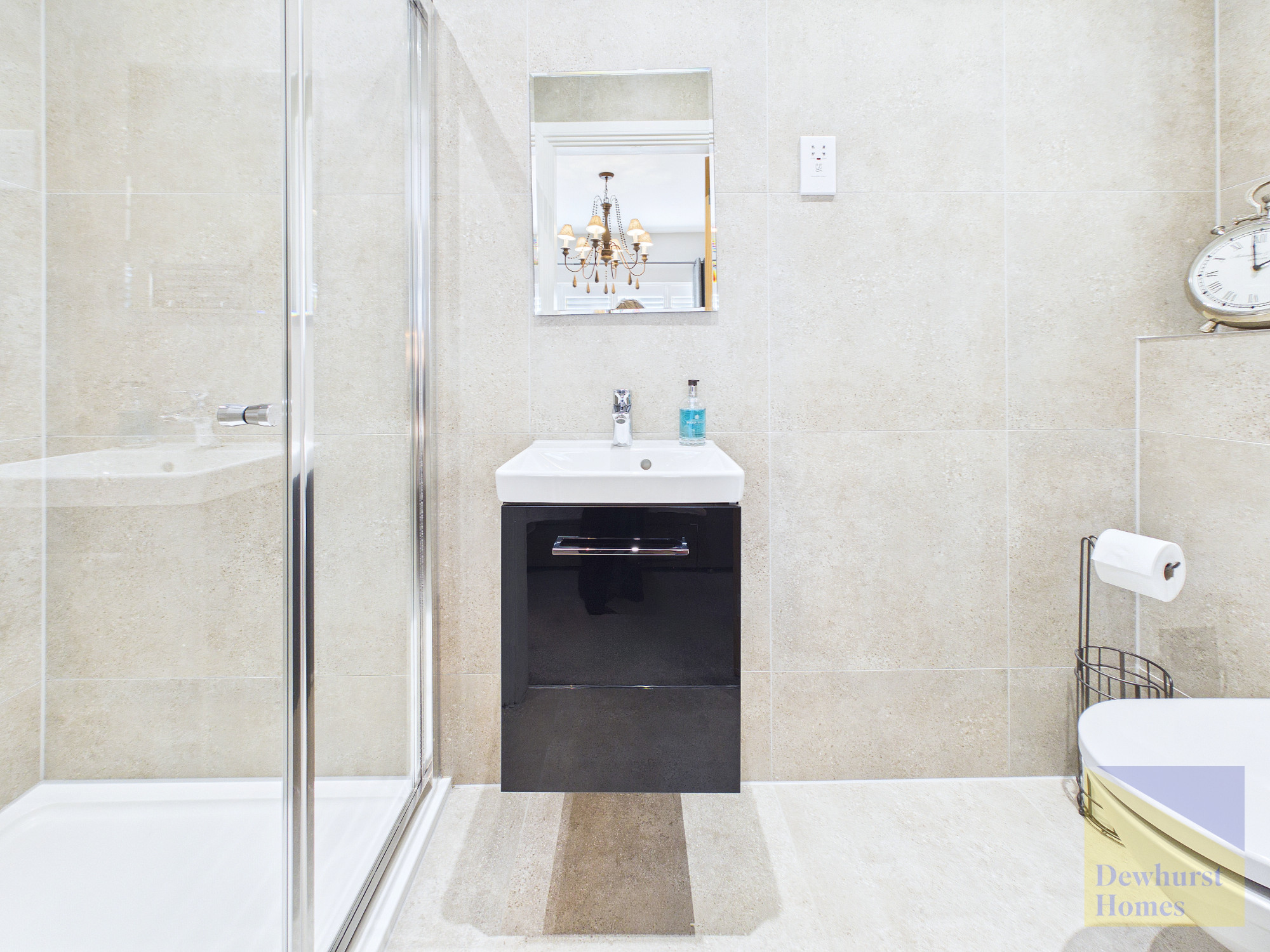 To the first floor, a bright and airy landing leads to four well-proportioned bedrooms. The principal bedroom benefits from dual aspect windows, stylish dΓ©cor, and a contemporary fully tiled en-suite shower room fitted with high-end sanitaryware. The remaining bedrooms include two generous doubles and a versatile single room, currently used as a nursery or additional workspace. The family bathroom is beautifully appointed, featuring a bath with shower attachment, a separate shower enclosure, and premium fittings including Villeroy & Boch sanitaryware and a modern illuminated mirror with Bluetooth connectivity.