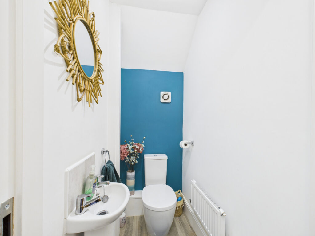 Upon entering through the welcoming porchway, you are greeted by a bright and spacious lounge featuring fitted blinds, chrome fittings, and modern spotlights that create a warm and inviting atmosphere. The downstairs WC adds further convenience for everyday family life.