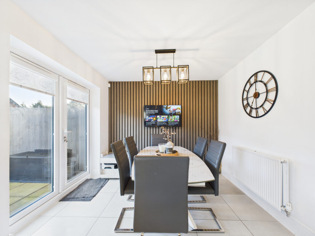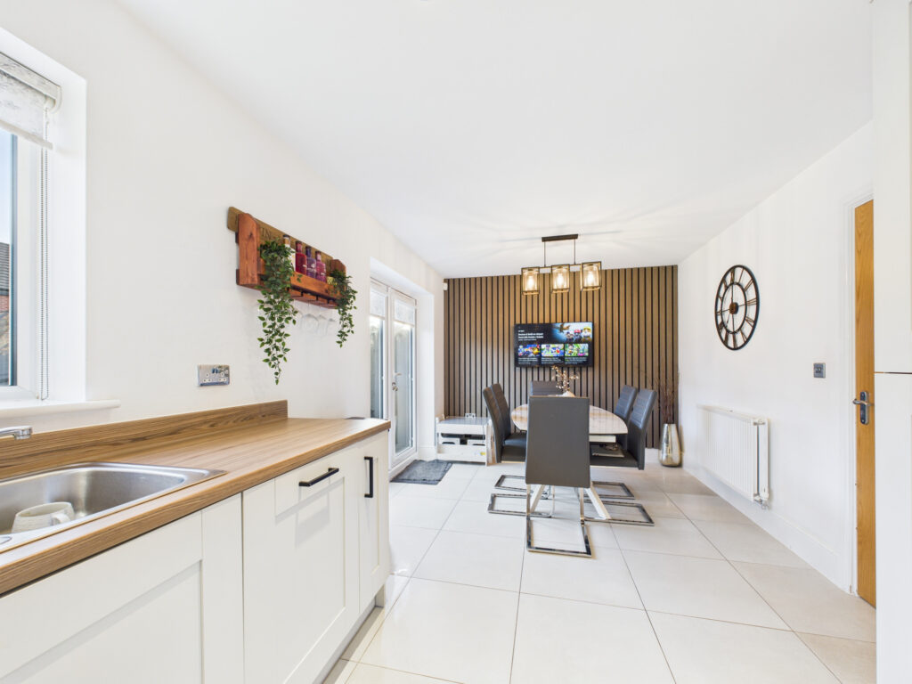 The heart of the home is the stylish kitchen and dining area, fitted with large gloss white tiles and modern wooden panel detailing. The kitchen boasts integrated appliances, including a fridge freezer and dishwasher, complemented by a Cuisine Master cooker—ideal for those who love to cook and entertain.
