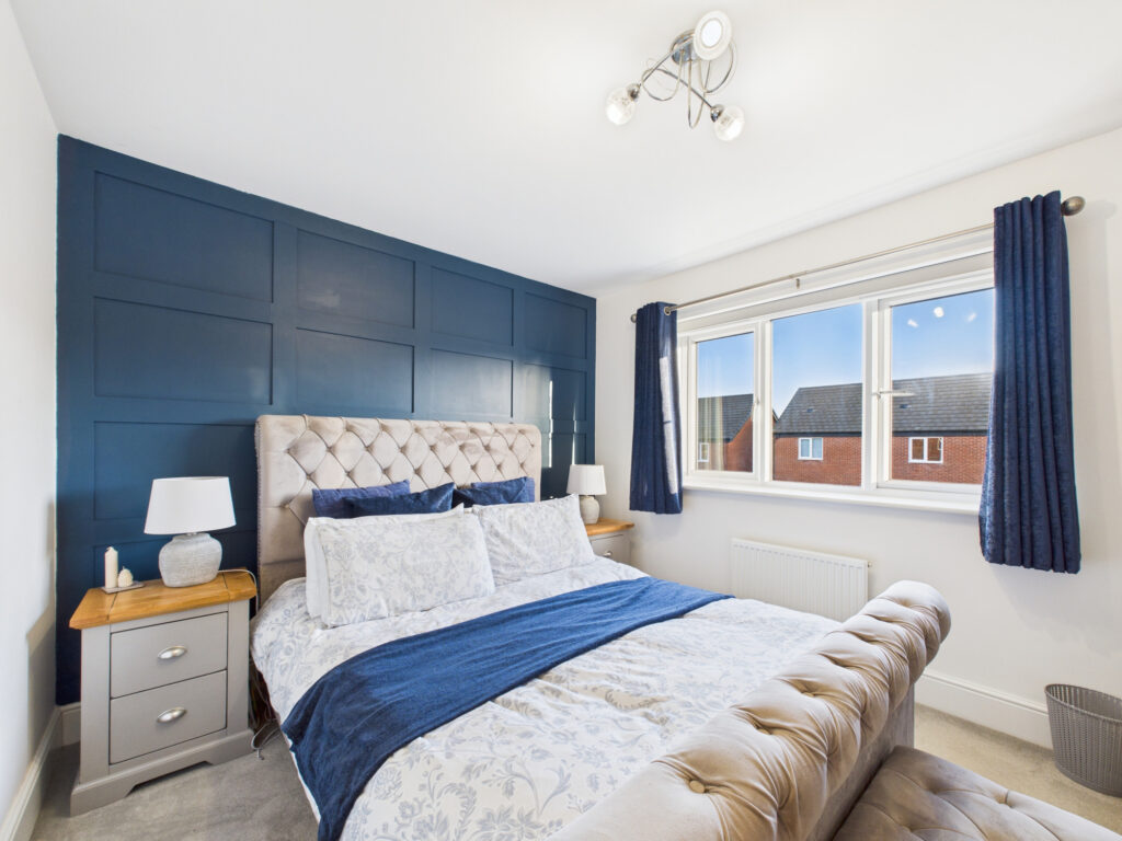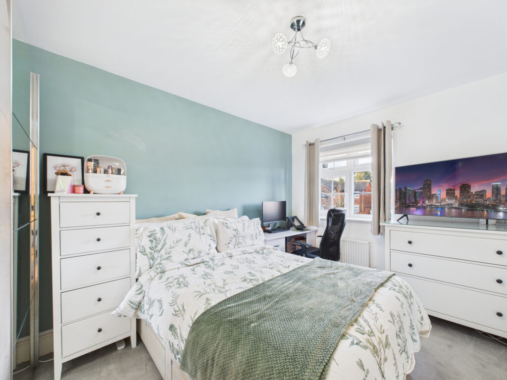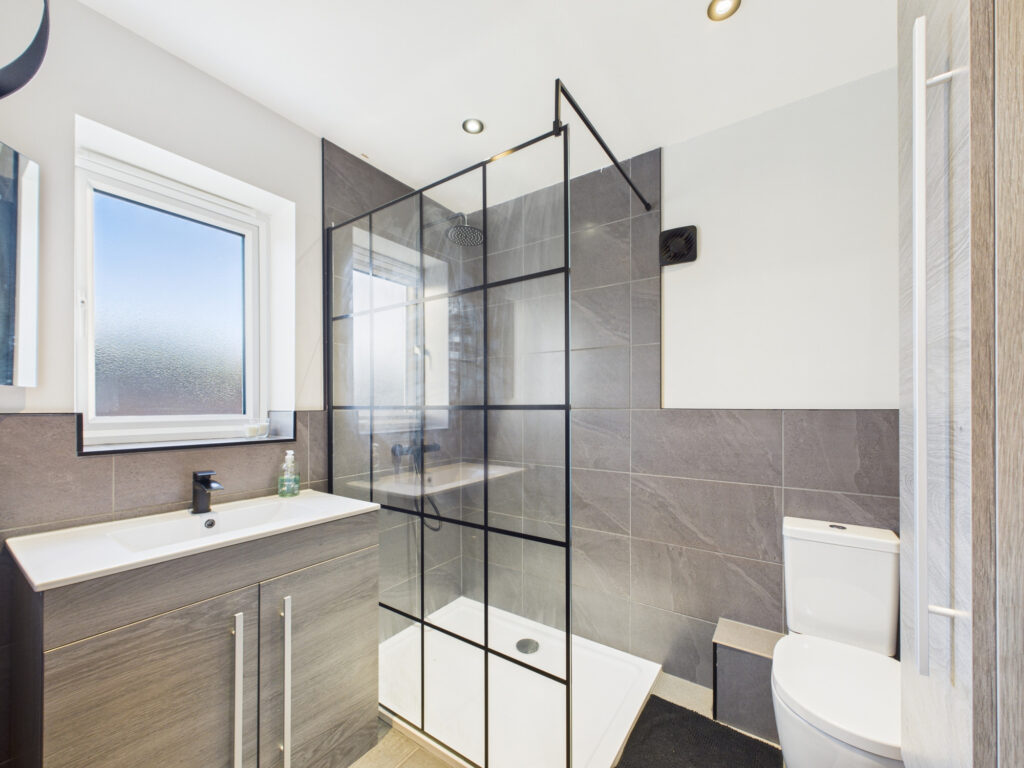 Upstairs, the spacious landing leads to three beautifully appointed double bedrooms. The main bedroom benefits from a larger-than-average en-suite with a sleek modern finish. The second bedroom offers ample space for a double bed, while the third double bedroom features attractive fitted wall panels, adding a touch of contemporary style.