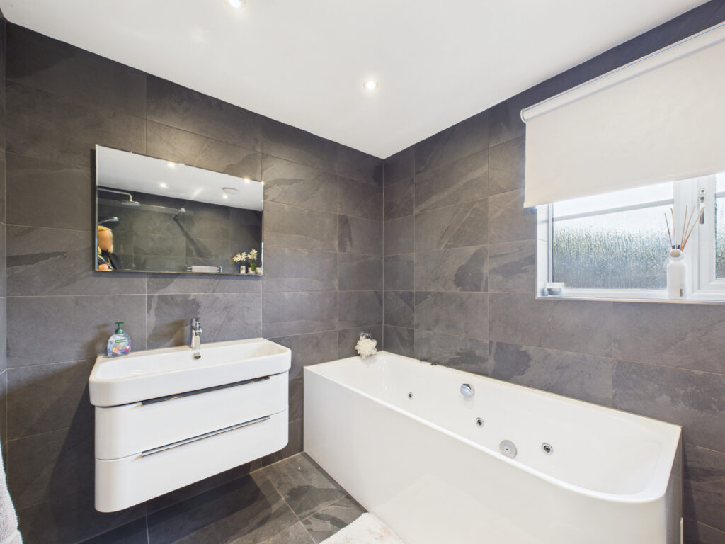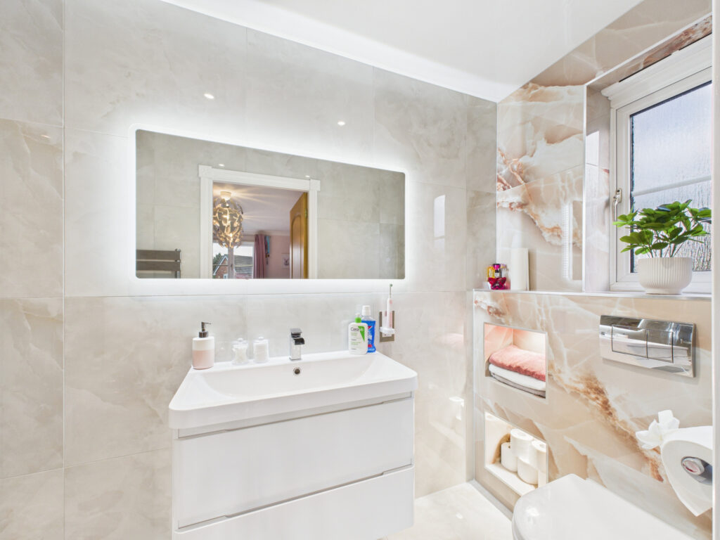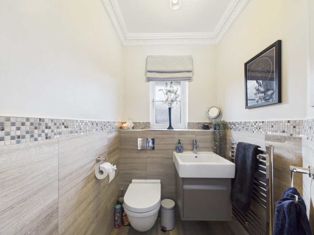 A utility room sits just off the kitchen and includes matching wall and base units with quartz worktops, plumbing for a washing machine and space for a dryer. A connecting door leads directly into the integrated garage, adding to the home’s practicality.
