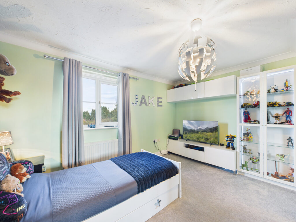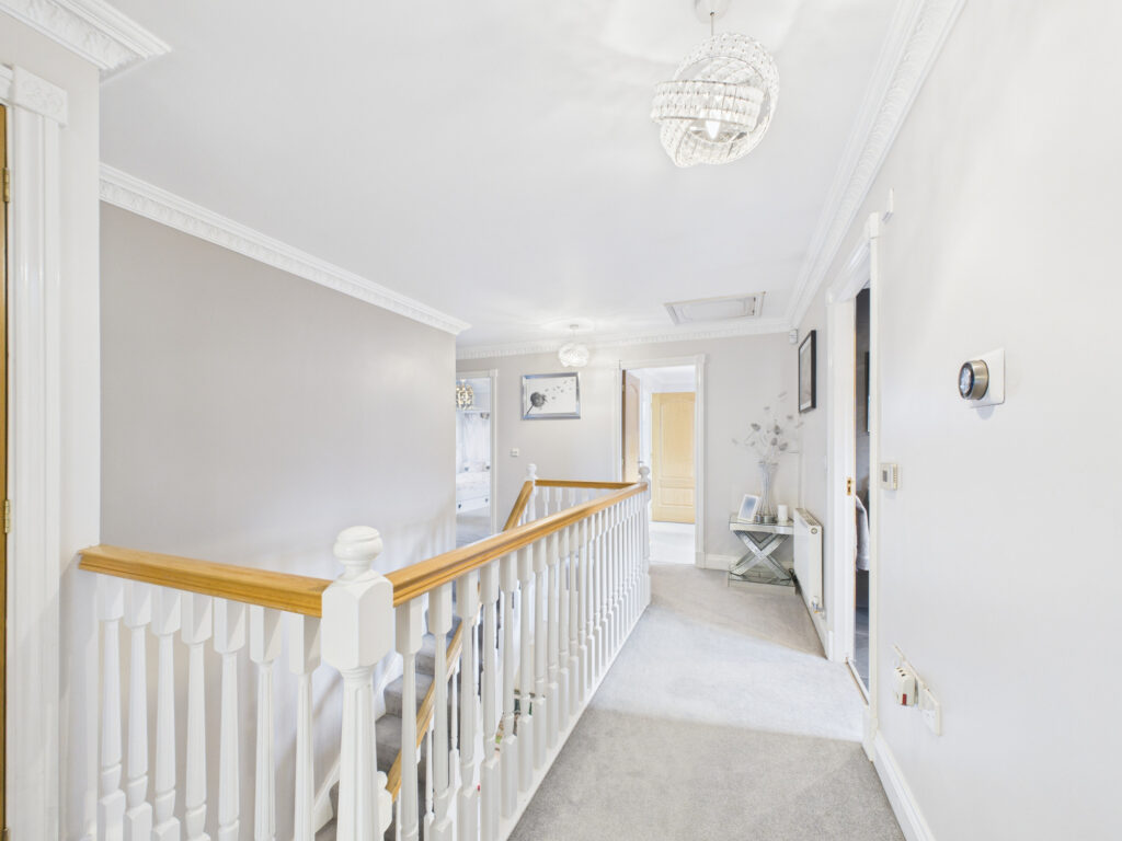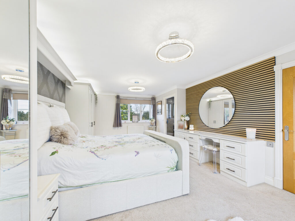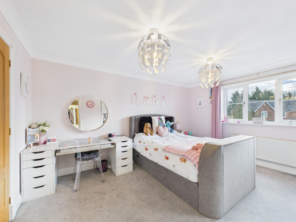 To the first floor, a spacious landing gives access to four well-proportioned bedrooms. The impressive principal suite enjoys windows to both the front and rear, fitted wardrobes and a generous en-suite shower room. The second bedroom also benefits from front-facing views and its own en-suite facilities. Two further bedrooms are served by a luxurious family bathroom, which features a spa-style bath, walk-in shower, wash hand basin and WC, along with underfloor heating and a heated towel rail.