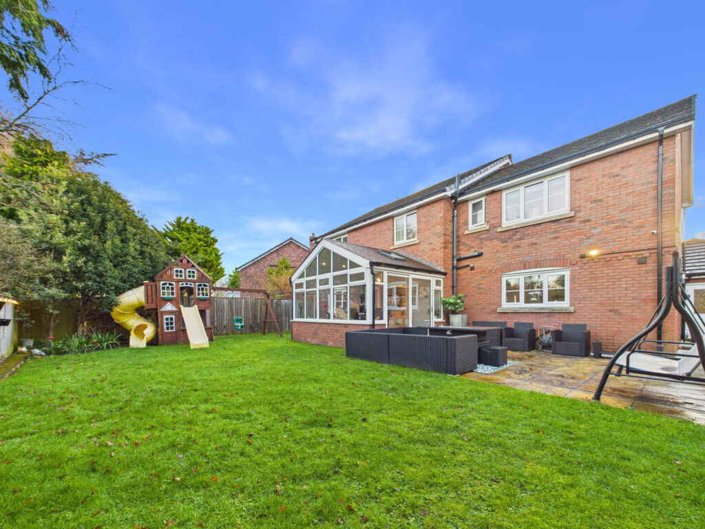 Externally, the integrated double garage is fitted with an electric up-and-over door, an EV charging point and internal access to the house. The front of the property offers attractive lawned and planted gardens alongside ample driveway parking. To the rear, the private garden is mainly laid to lawn with a patio seating area and well-stocked borders, creating an ideal space for outdoor relaxation and entertaining.