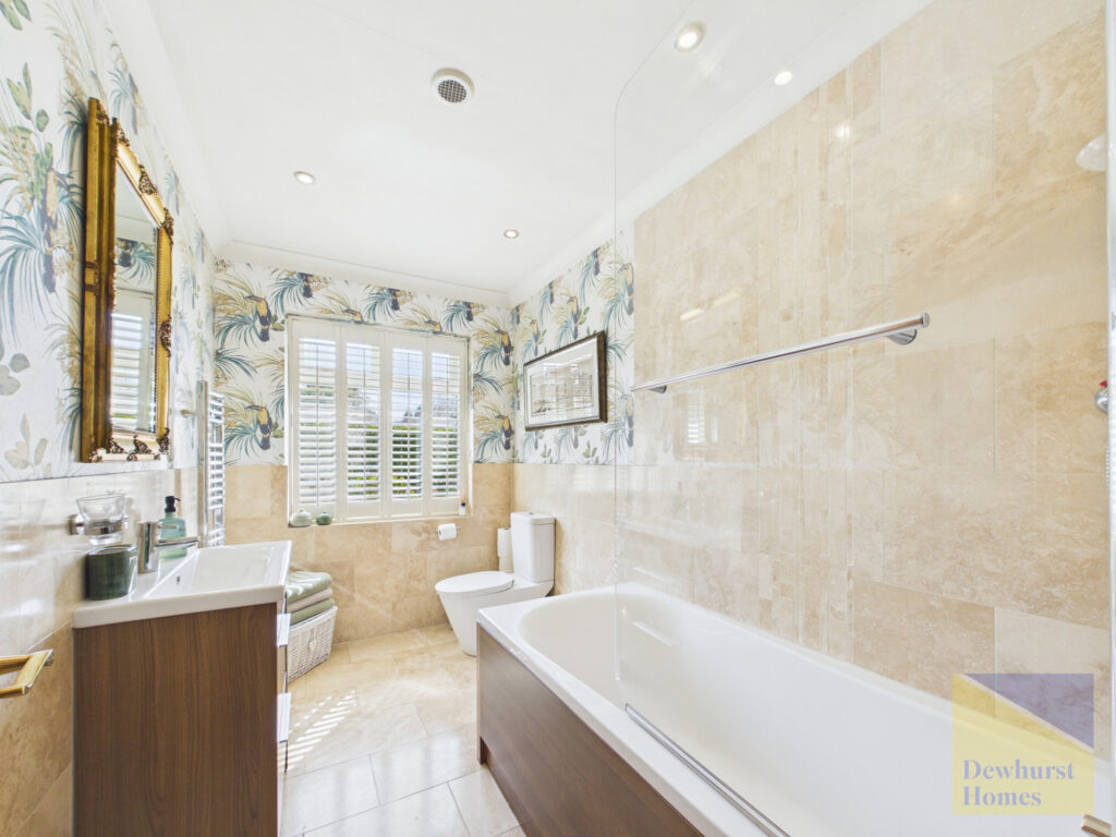 A modern family bathroom serves the home, complete with vanity sink unit, part tiled walls, and tiled flooring. A separate utility room adds further practicality.