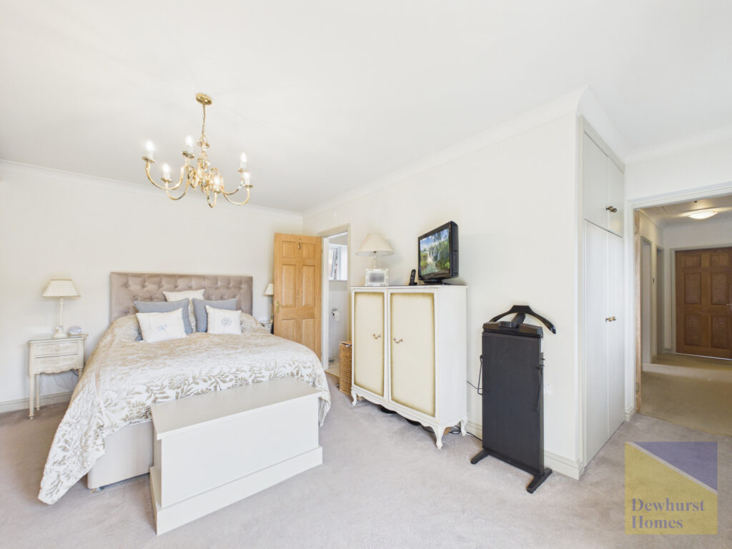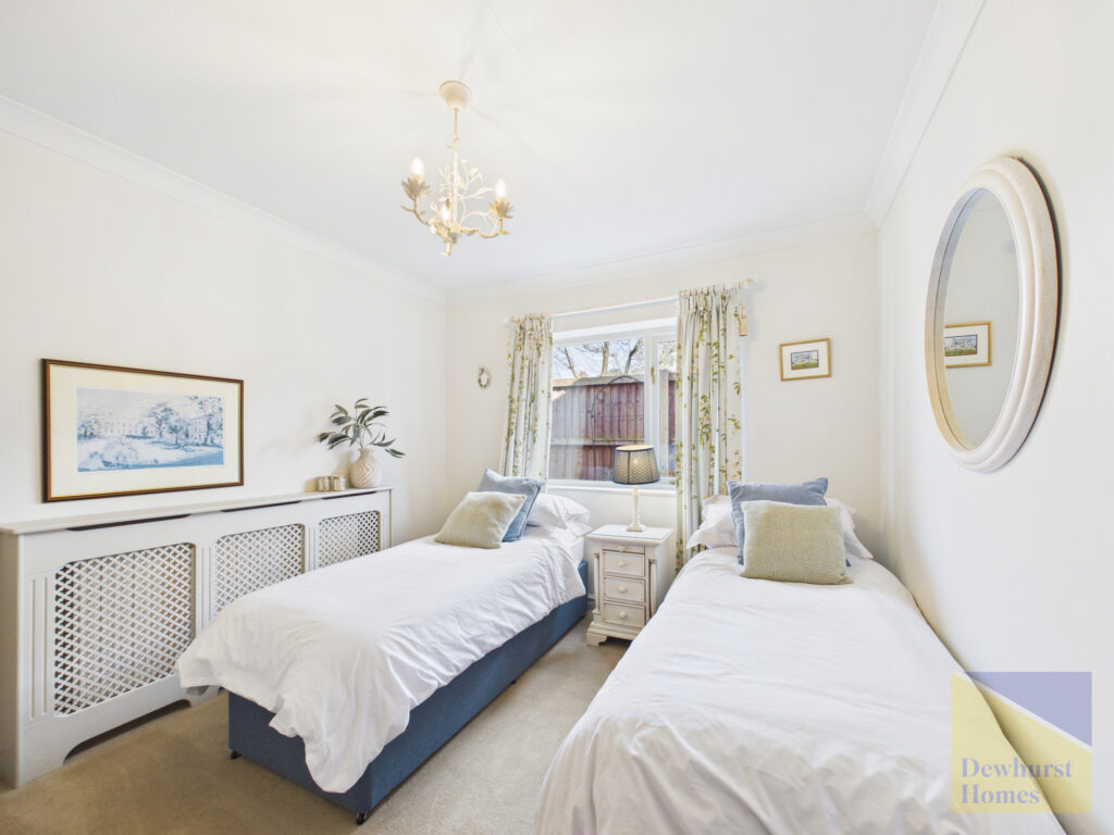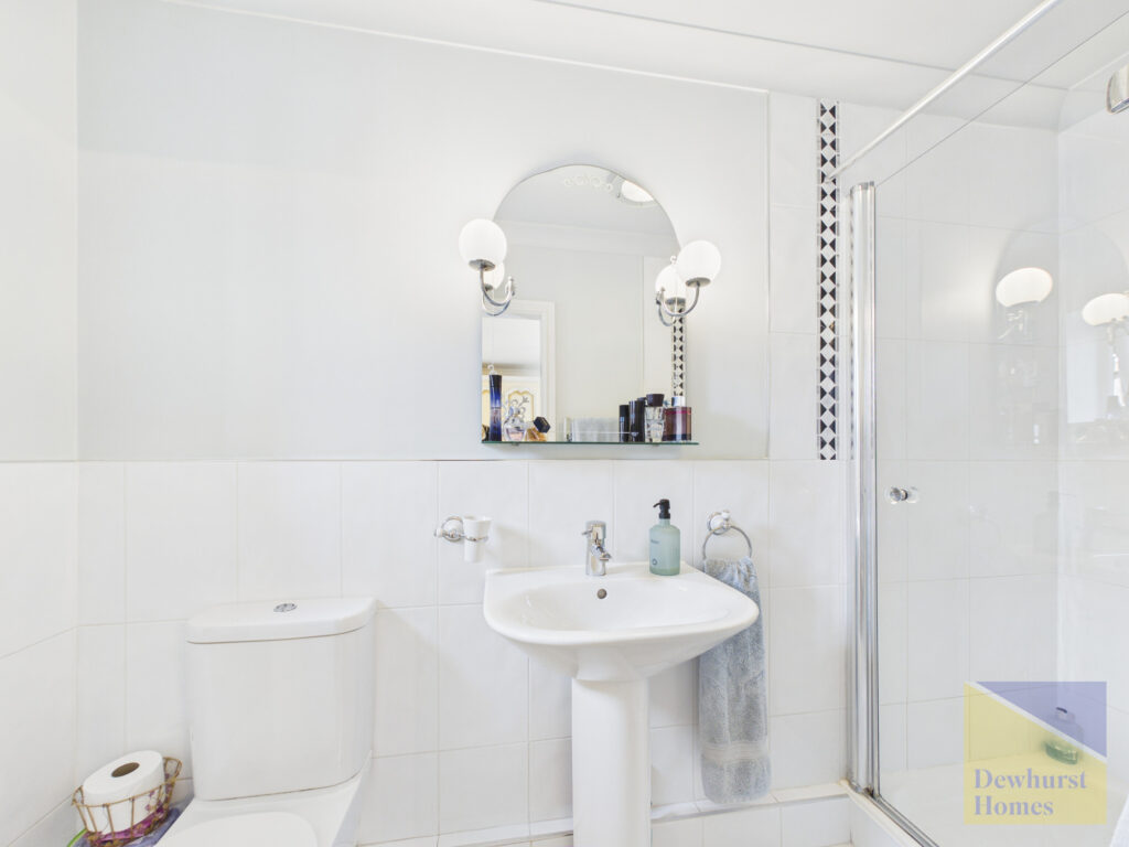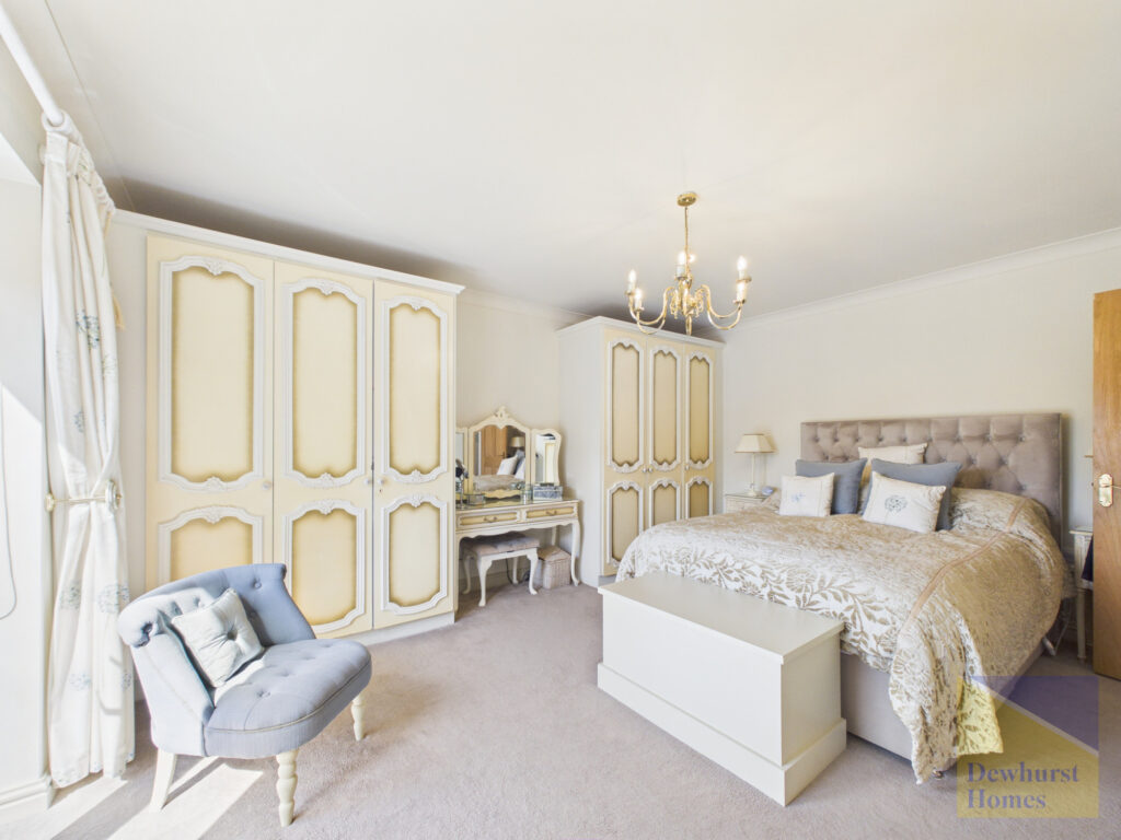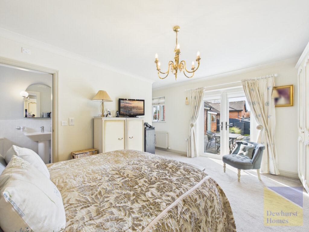 The property offers three well-proportioned bedrooms. The front double bedroom is bright and airy with a large window, while the second double bedroom is positioned to the side of the property. The principal suite is located to the rear, benefiting from fitted storage, direct access to the garden via patio doors, and a spacious en-suite.