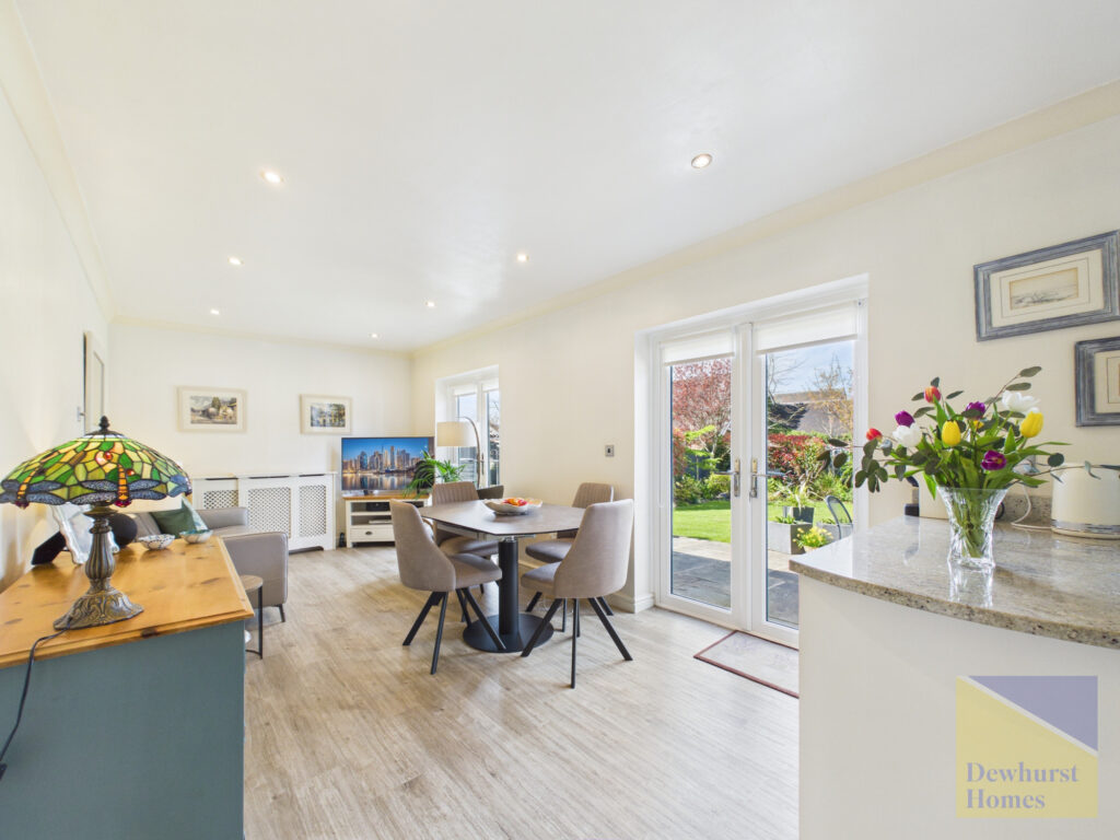 The heart of the home is the stunning open-plan kitchen, dining, and family area—truly picture perfect. Flooded with natural light from two sets of patio doors and an additional kitchen window, this space seamlessly connects indoor and outdoor living. The kitchen is fully equipped with high-end NEFF appliances and complemented by stylish Amtico flooring, all overlooking the beautifully landscaped rear garden.