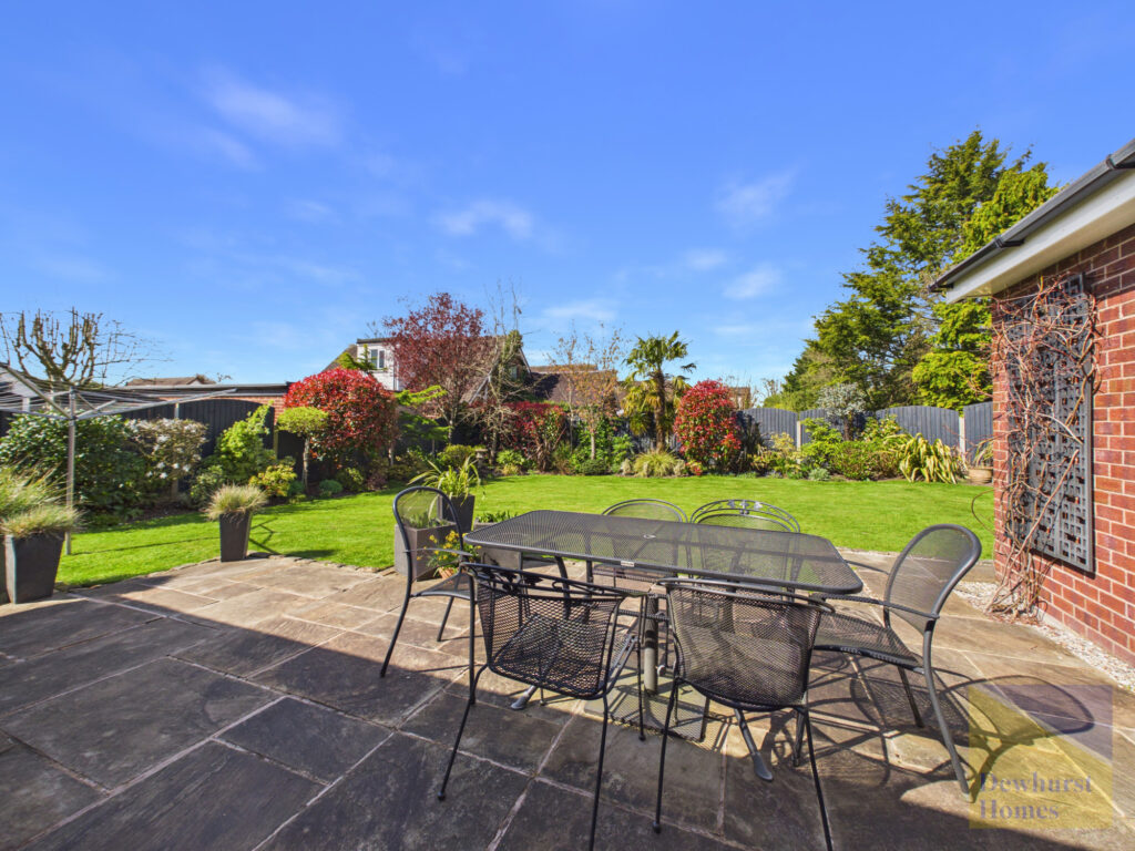 Externally, the rear garden is simply stunning—beautifully maintained with mature shrubbery, crisp lawn edges, and a private, not overlooked aspect. A patio seating area and garden shed complete this idyllic outdoor space.