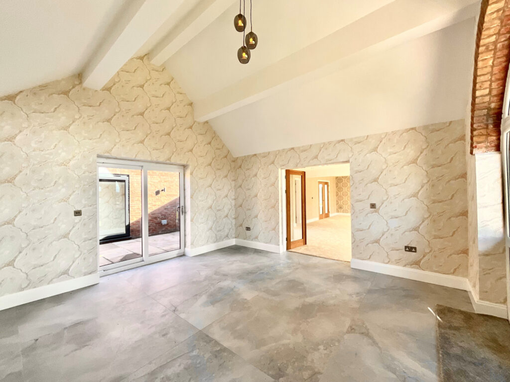 The welcoming entrance hallway immediately sets the tone for the home’s impressive interior, featuring a reclaimed redbrick archway, full-height ceiling with exposed beams, and travertine tiled flooring. Double doors lead through to both the main lounge and a spacious second reception room, ideal as a formal dining area, media room, or games room.