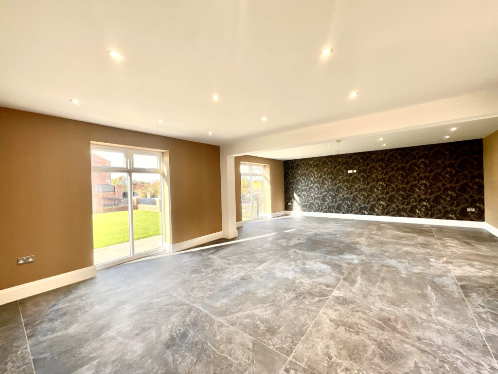 27'1 x 17'7 (8.26m x 5.36m) Three large double glazed windows. Inset ceiling spotlights and central ceiling light point, Dark Grey marble effect travertine tiled floor, brushed chrome sockets and light switches and television point. Wall mounted underfloor heating control, built in cupboard housing the underfloor heating manifolds.
