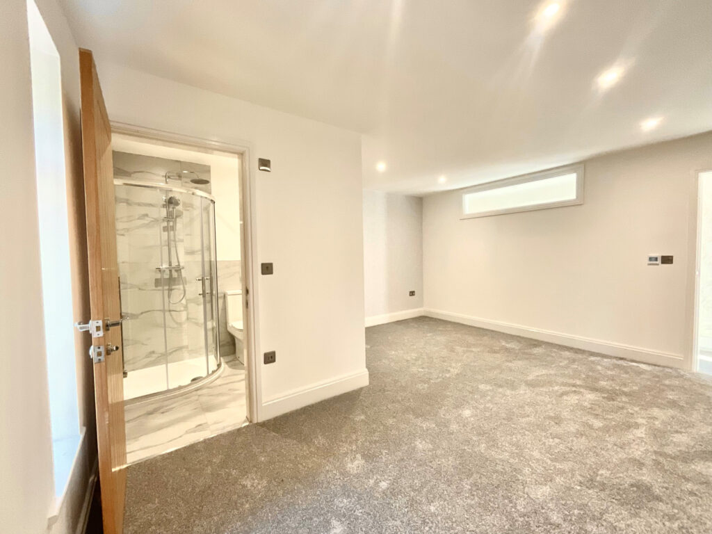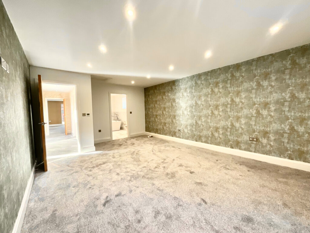 The property offers four generously sized bedrooms, three of which feature luxurious en-suite shower rooms finished with quality fittings, vanity units, and chrome heated towel rails. The remaining bedroom benefits from access to a beautifully appointed Jack and Jill bathroom, complete with a freestanding bath and walk-in shower. Each bedroom has been designed with style and comfort in mind, with modern lighting, brushed chrome fittings, and double-glazed windows throughout.