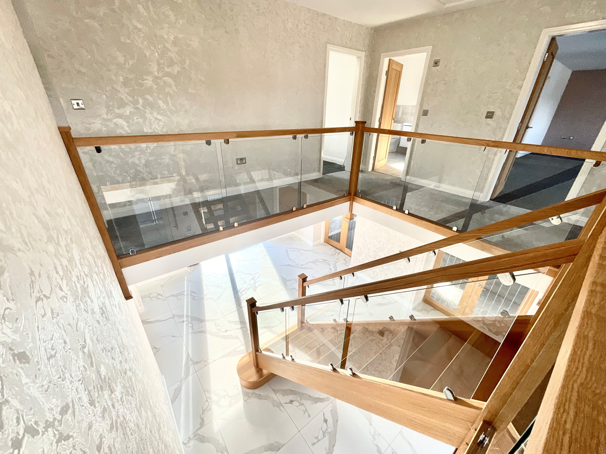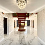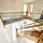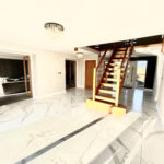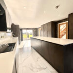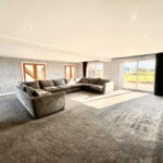 The home opens into a magnificent dining hall, an impressive statement of scale and design featuring marble-effect tiled flooring, a glazed oak staircase, and an abundance of natural light. From here, double doors lead through to both the dining kitchen and the imposing lounge, each finished with the same attention to detail and flow that defines the property.