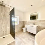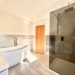 There are three further double bedrooms, each beautifully appointed and two of which enjoy their own private en-suite shower rooms, while the main house bathroom provides a stunning contemporary finish with a freestanding bath and walk-in shower. Every detail, from brushed chrome fittings to bespoke tiling and anti-steam mirrors, reflects the quality and care invested in this remarkable home.