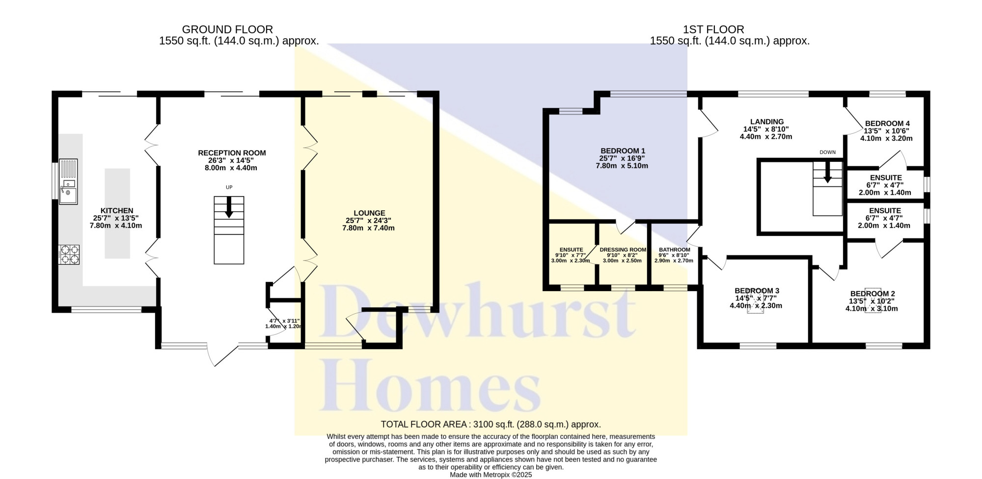 The home features a grand dining hall, a beautifully designed kitchen with a large central island and AEG integrated appliances, and an imposing lounge with dual-aspect windows. The first floor hosts four generous bedrooms, including a luxurious principal suite with a dressing room and en-suite, plus two further en-suites and a stylish main bathroom.
