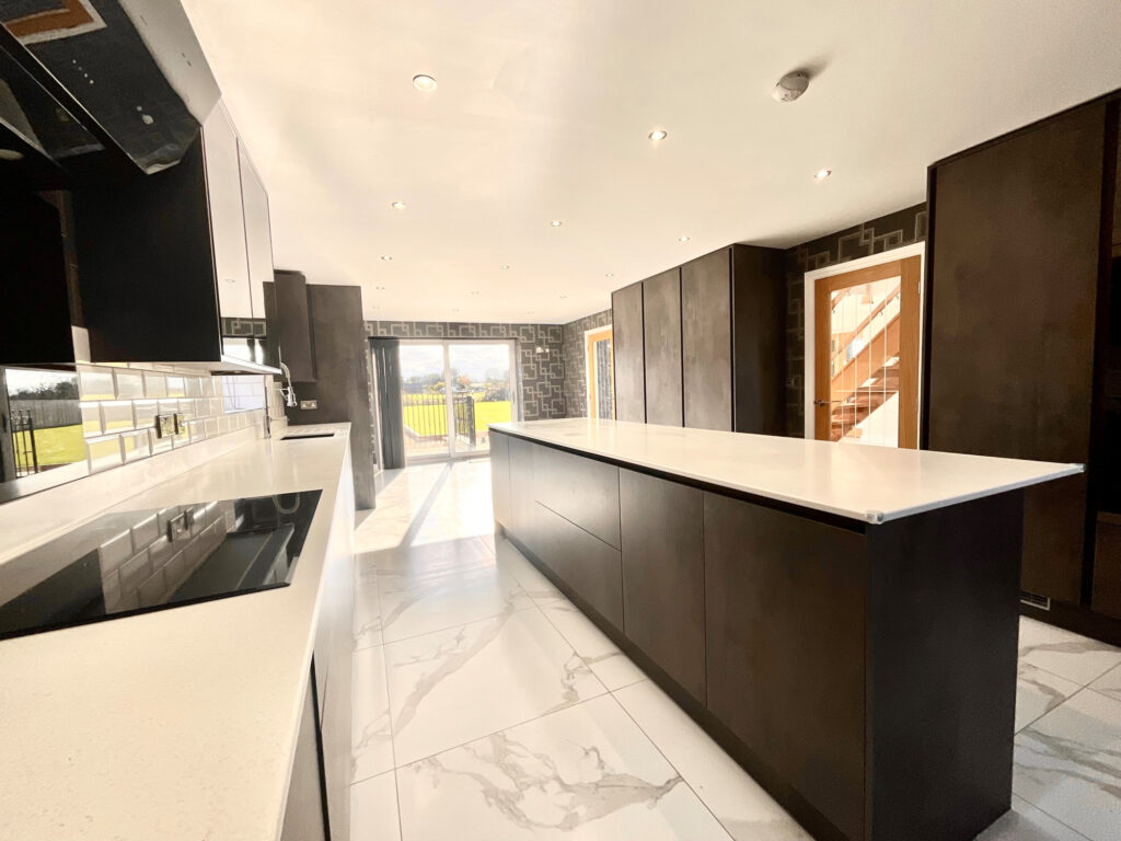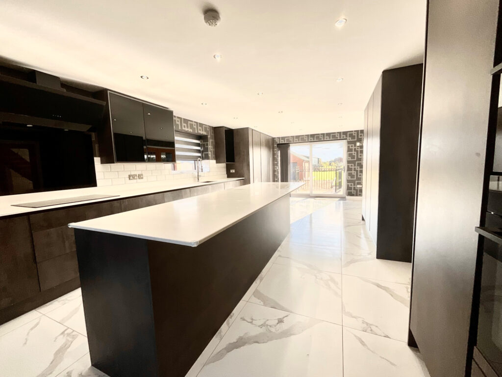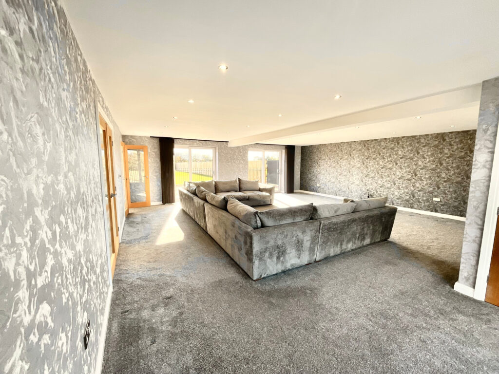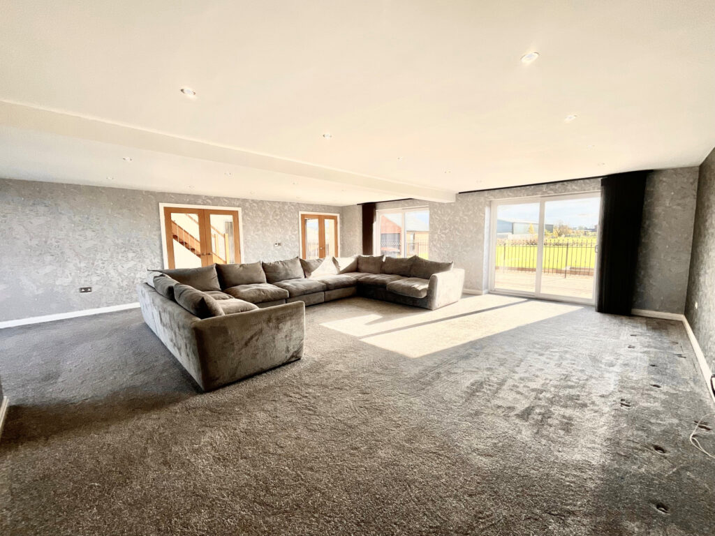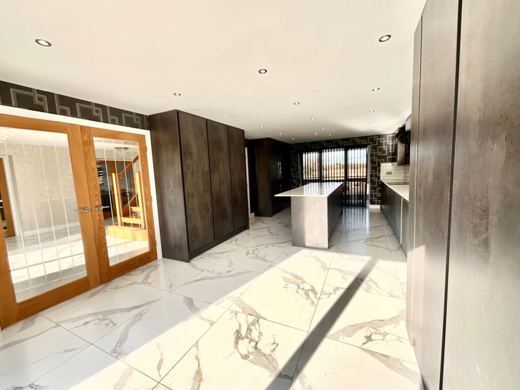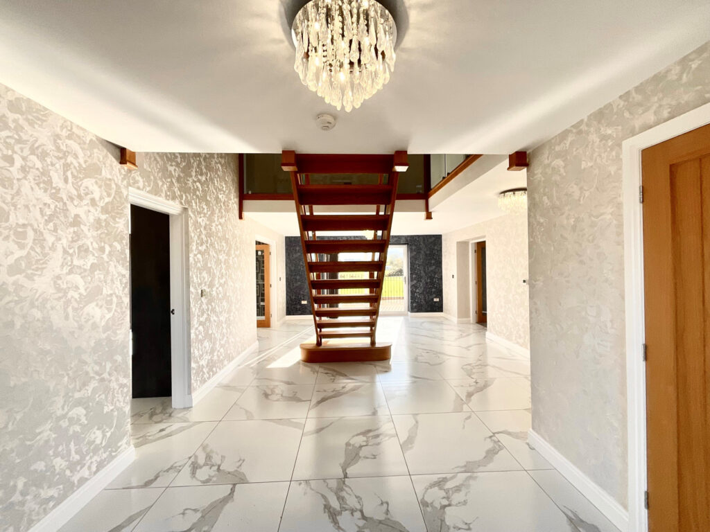 The home opens into a magnificent dining hall, an impressive statement of scale and design featuring marble-effect tiled flooring, a glazed oak staircase, and an abundance of natural light. From here, double doors lead through to both the dining kitchen and the imposing lounge, each finished with the same attention to detail and flow that defines the property.
