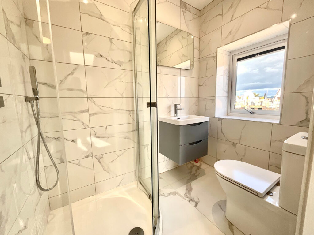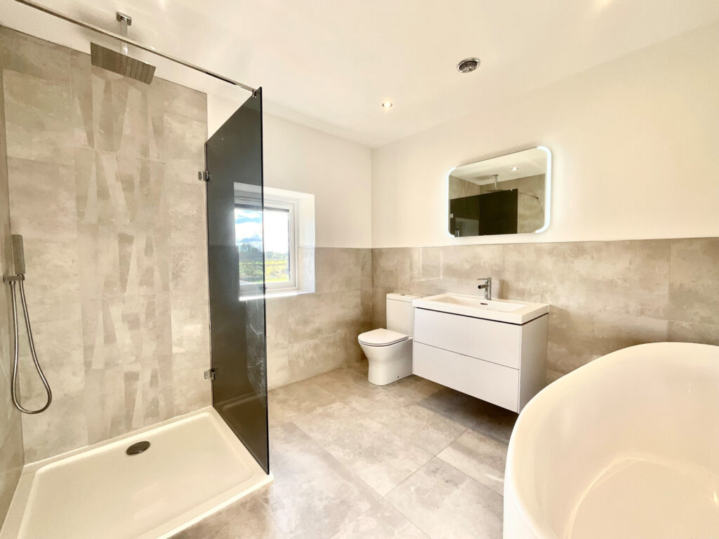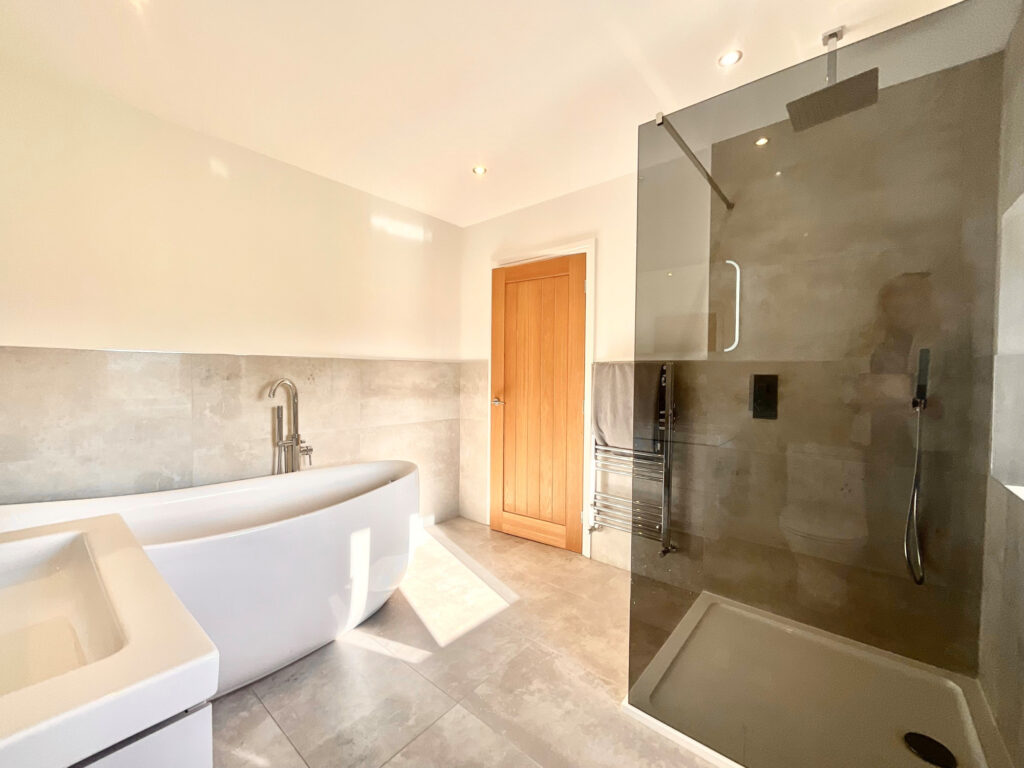 There are three further double bedrooms, each beautifully appointed and two of which enjoy their own private en-suite shower rooms, while the main house bathroom provides a stunning contemporary finish with a freestanding bath and walk-in shower. Every detail, from brushed chrome fittings to bespoke tiling and anti-steam mirrors, reflects the quality and care invested in this remarkable home.