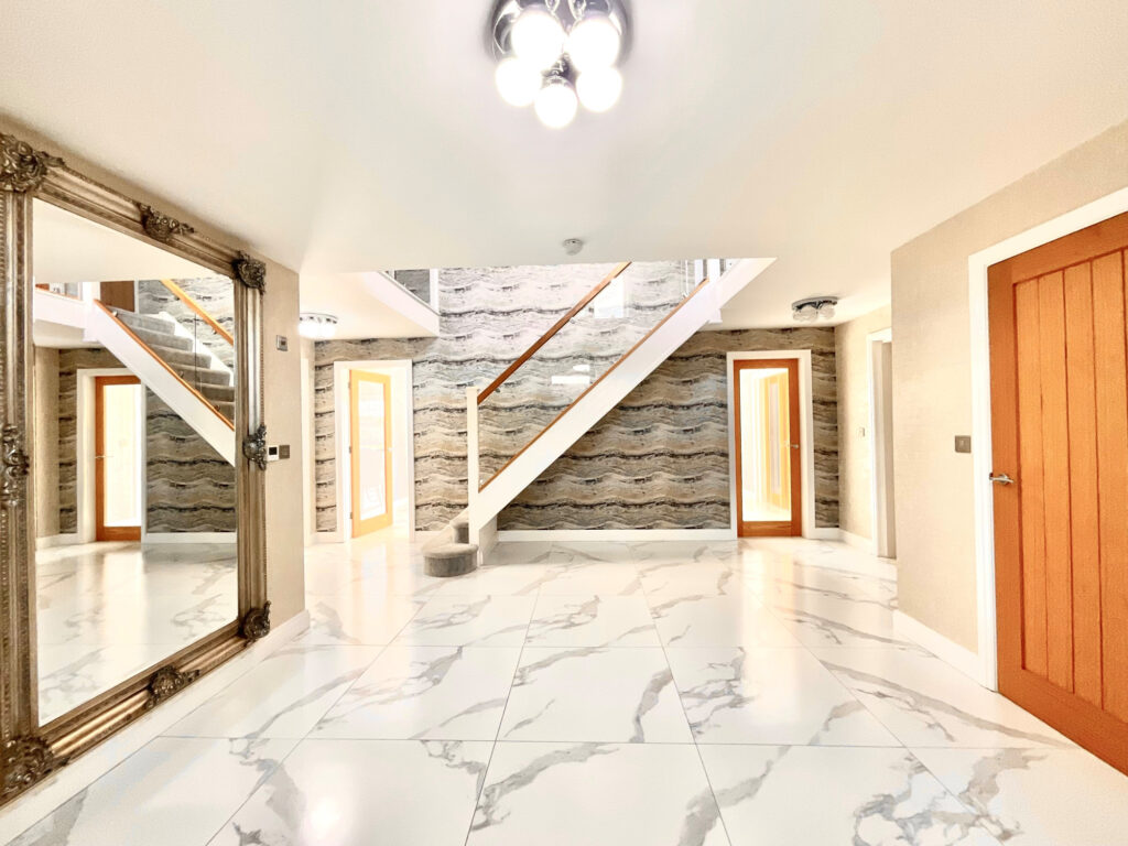 The accommodation is generously proportioned throughout, beginning with a grand entrance hall that immediately sets the tone for the rest of the property. From here, doors lead to a spacious lounge, a separate dining room, and a stunning open-plan dining kitchen, all beautifully appointed and designed for modern living. The ground floor also features a cloakroom/WC, a practical utility room, and an additional laundry room, which could also serve as a home office or study.
