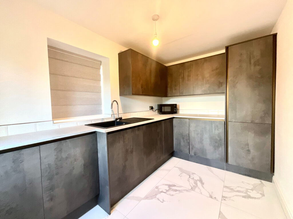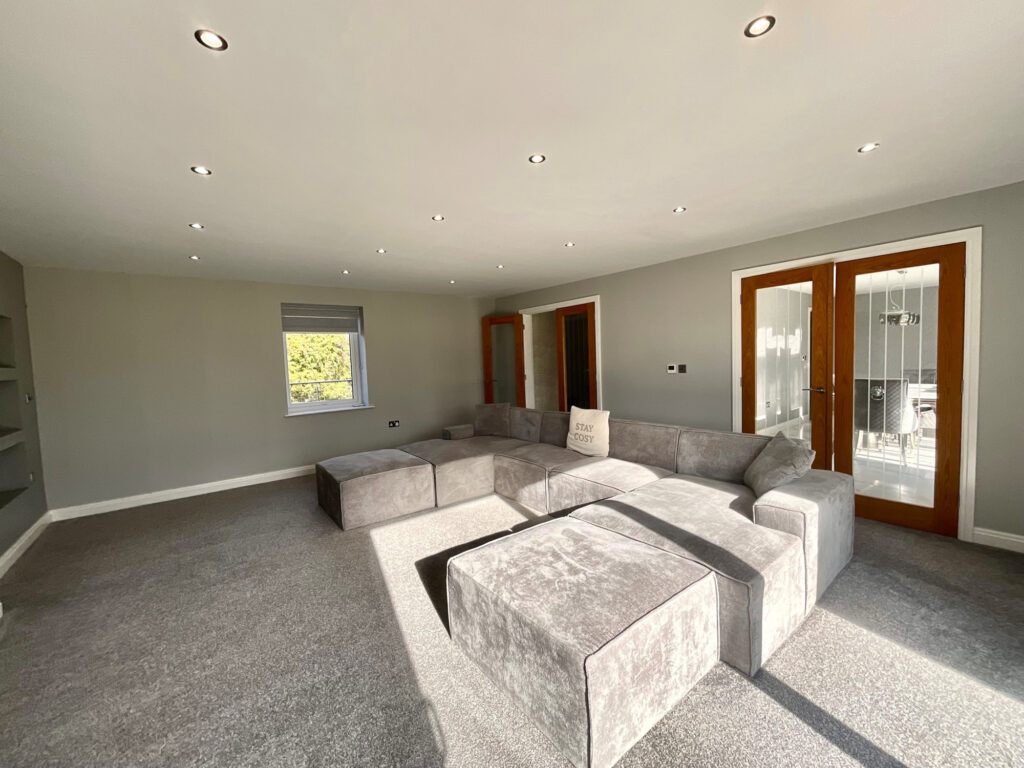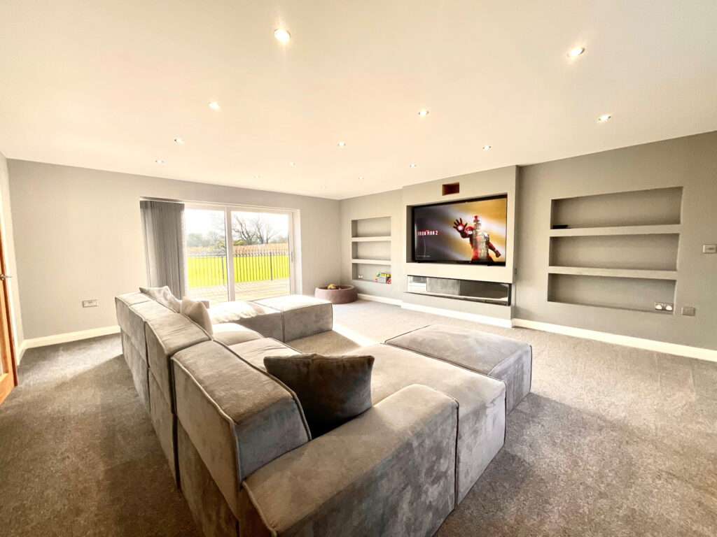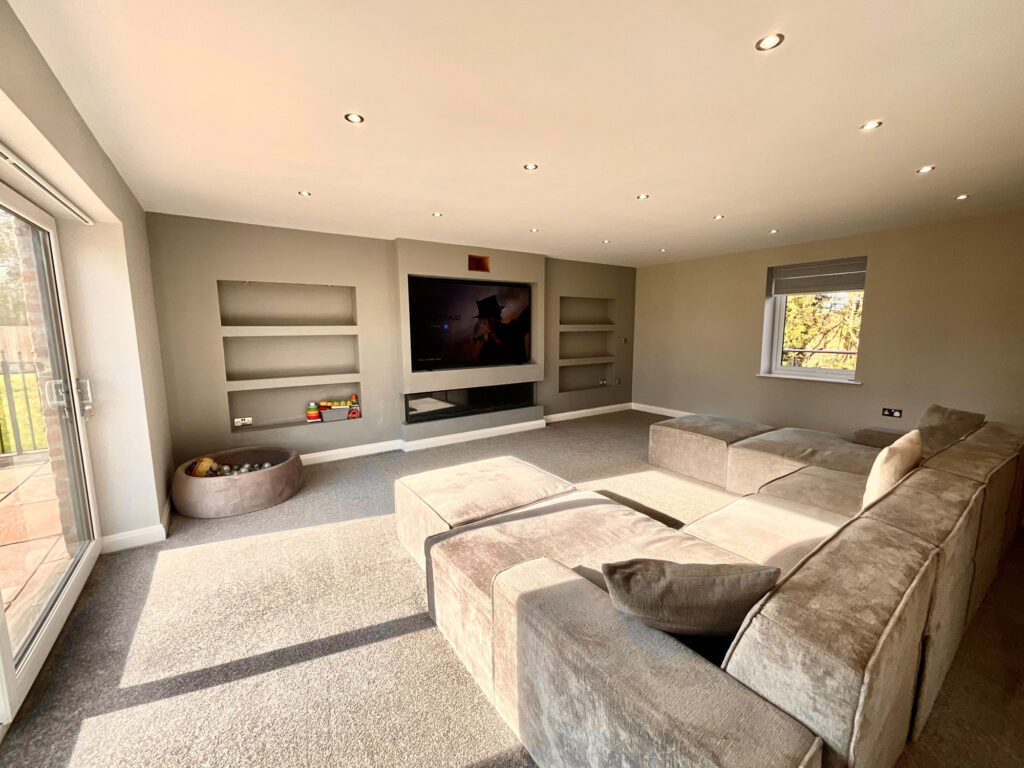 The lounge is both inviting and elegant, featuring a bespoke media wall with an electric fire and illuminated shelving, while large windows and sliding doors flood the room with natural light and provide seamless access to the rear terrace. The dining room connects to both the lounge and hall, making it ideal for entertaining.
