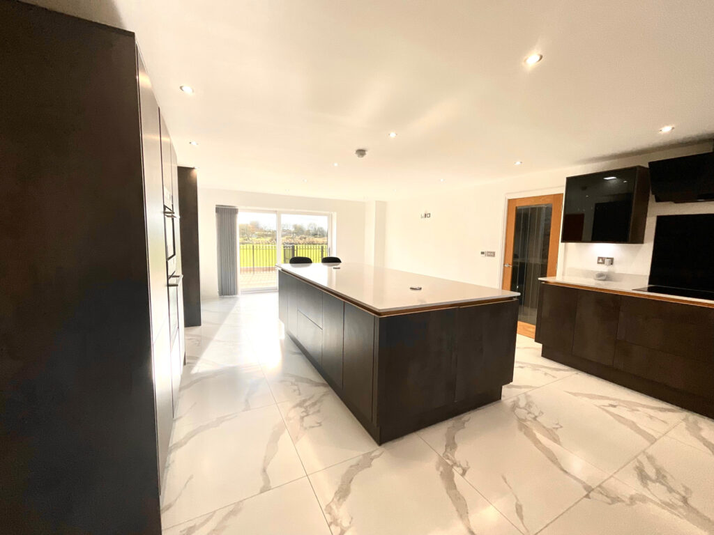 The heart of the home is undoubtedly the impressive dining kitchen, fitted with a comprehensive range of contemporary wall and base units, a large central island, and integrated AEG appliances including an induction hob, oven, combination microwave, fridge/freezer, and dishwasher. Granite work surfaces, a composite sink, and marble-effect tiled flooring complete this sophisticated space, which opens through glazed sliding doors onto the rear patio and garden.