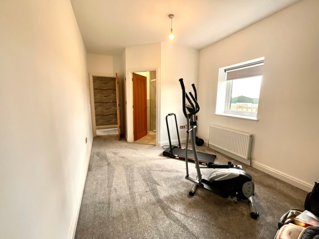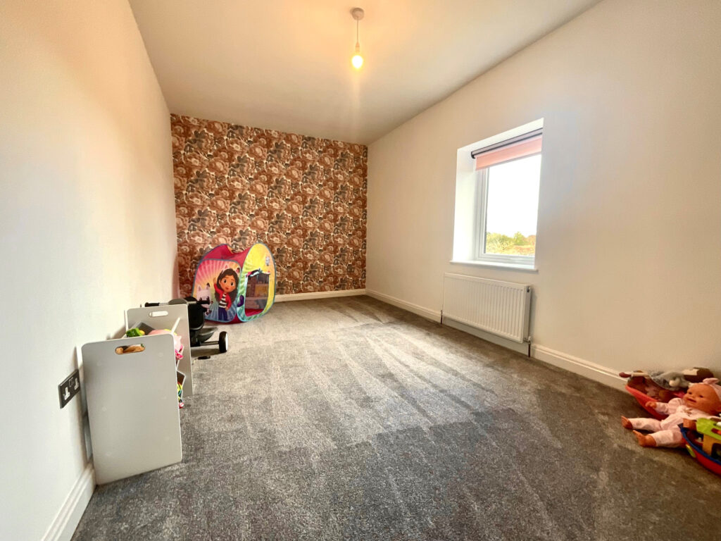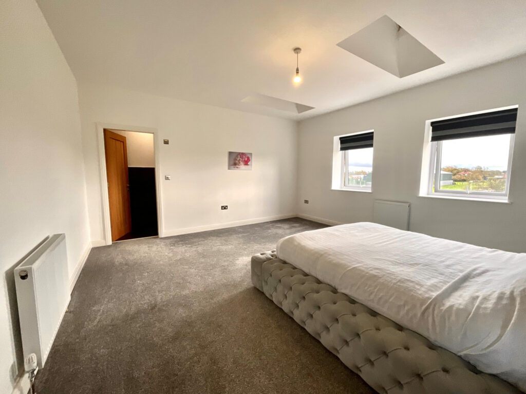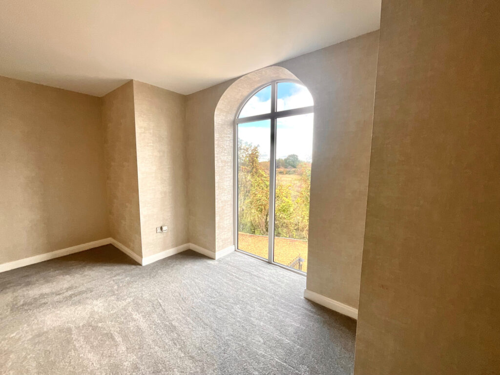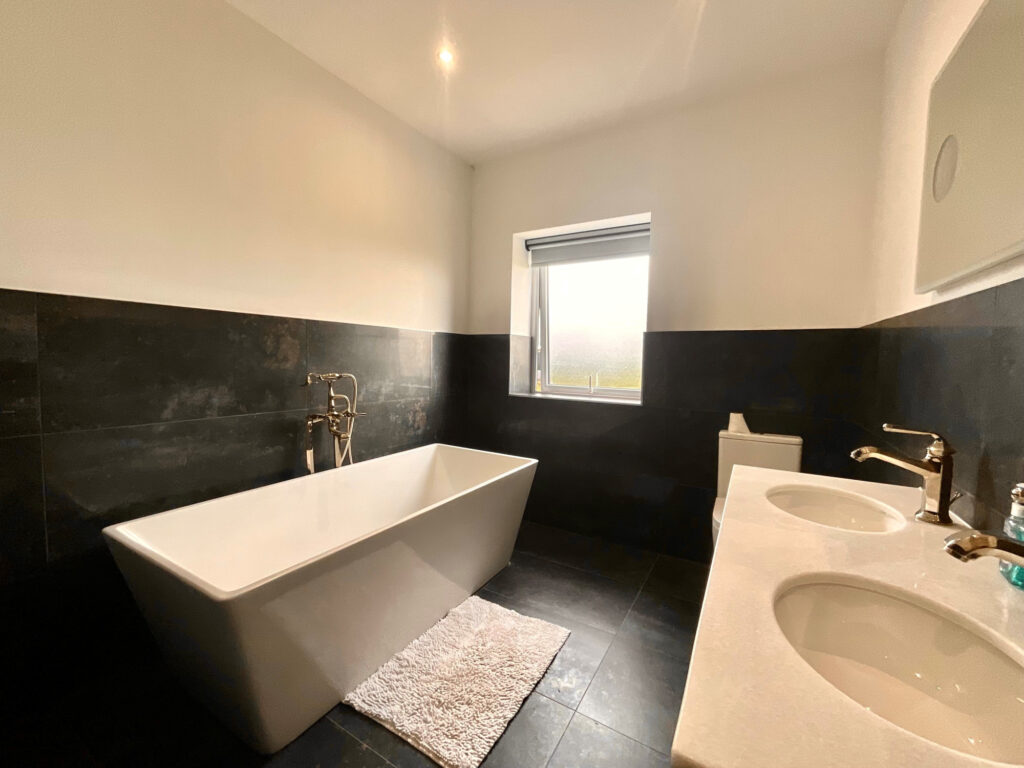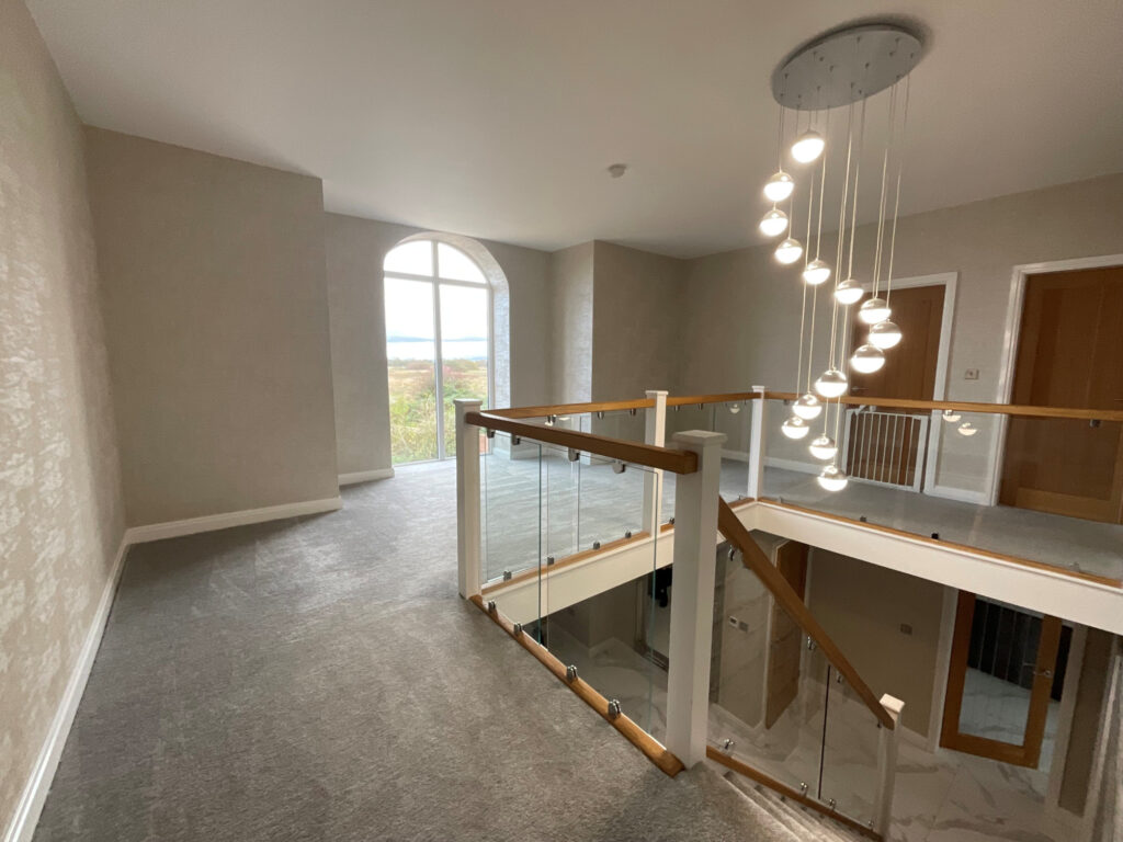 Upstairs, an impressive galleried landing with glass balustrades and a feature stone arch window offers views across the surrounding countryside. The first floor hosts five bedrooms in total, two of which benefit from luxurious en-suite facilities. The principal bedroom is particularly spacious, complete with a beautifully finished en-suite featuring a double vanity unit and walk-in shower. The family bathroom includes a freestanding bath, wash hand basin, and WC, all enhanced by stylish tiling and contemporary fittings.