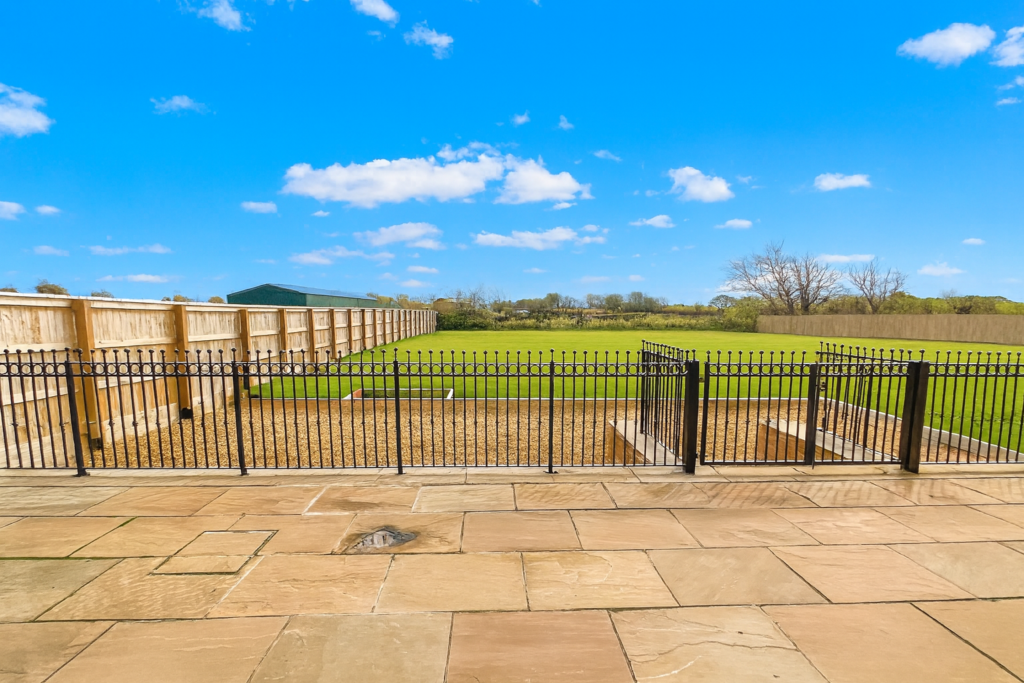 Outside, the property is equally impressive. The approach to Carr House Farm is through a pair of striking red brick pillars with wrought iron gates, leading to a generous driveway and detached double garage. Steps rise to the front entrance and a raised patio area, enclosed by sleek steel and glass balustrades that continue around to the rear of the home. The large rear garden is mainly laid to lawn and enclosed by timber fencing, providing ample space for outdoor living. Beyond the main garden, double timber gates open to an additional half-acre of land, ideal for use as a smallholding, equestrian space, or simply for recreation and leisure.