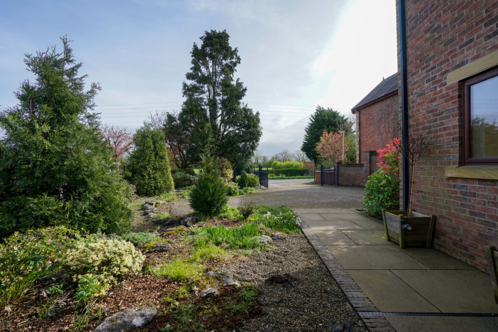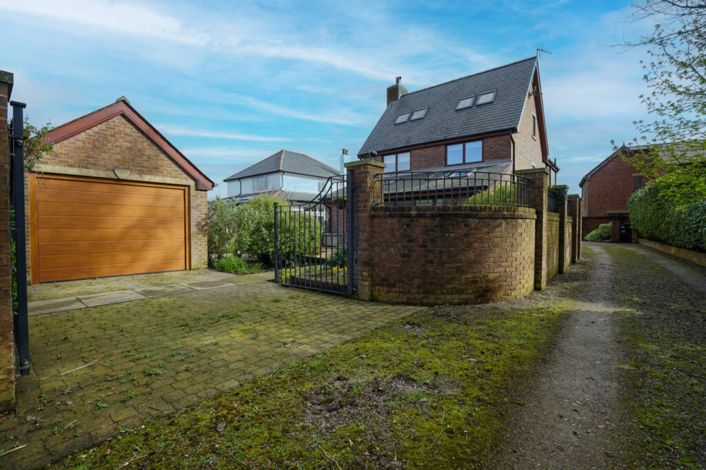 Externally the home is set back from the road and has a wrap around private Balderstone gravel driveway which leads to a generous detached brick built garage with electric door under a slate pitched roof and turning area. These are flanked with well established laurel hedge and borders with mature shrubs.