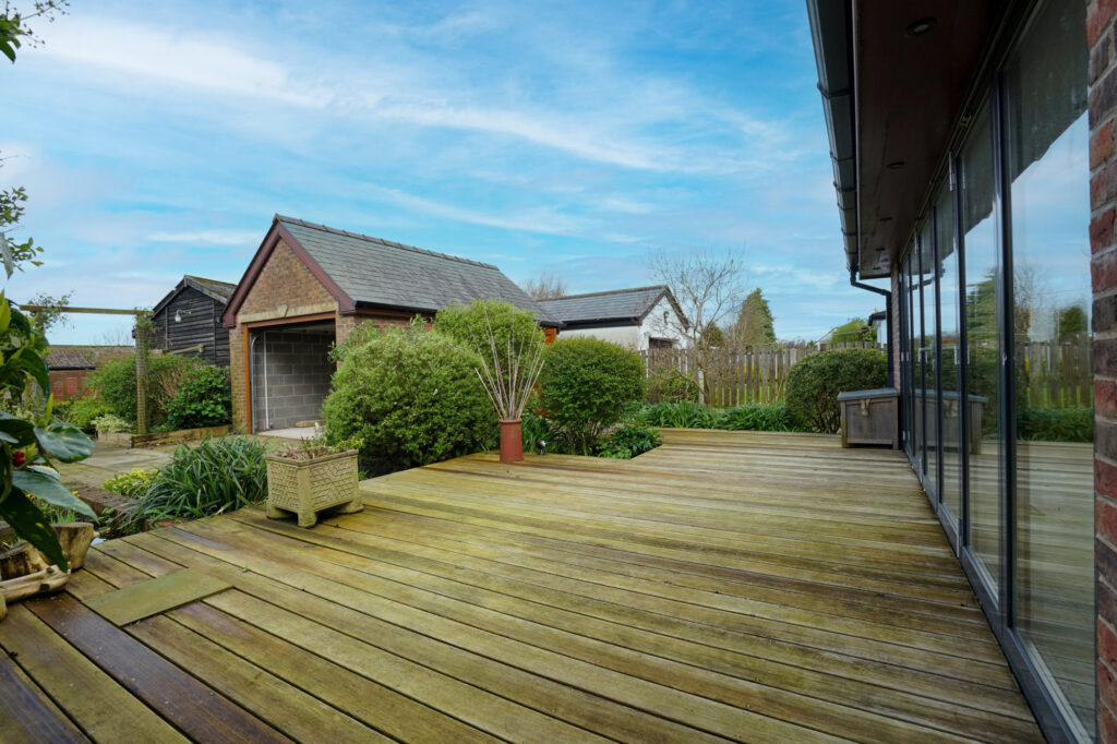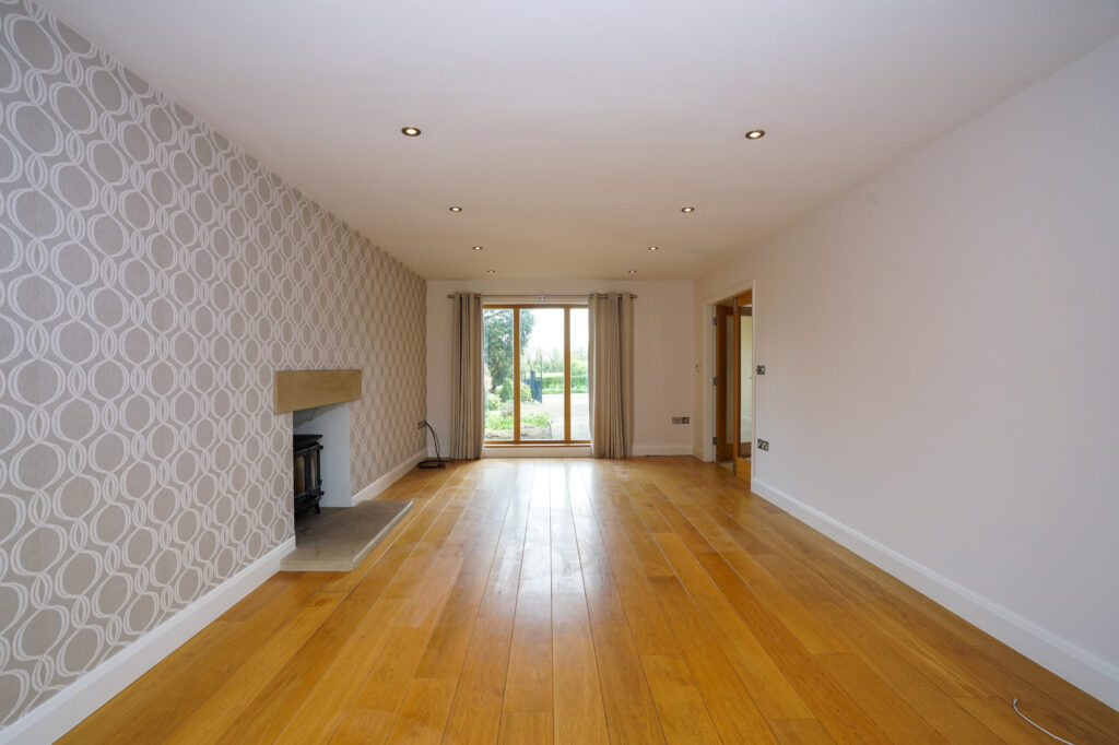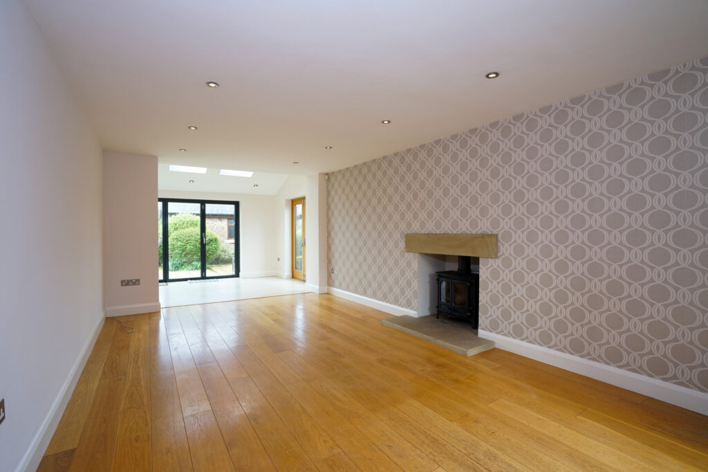 The living room is a fantastic size with a central fireplace with a real wood burner. The room is flooded with light from the large windows and is fitted with oak flooring. This open plan area leads to the rear living accommodation which is ideal for a formal dining area or relaxing space overlooking the rear garden and decking.