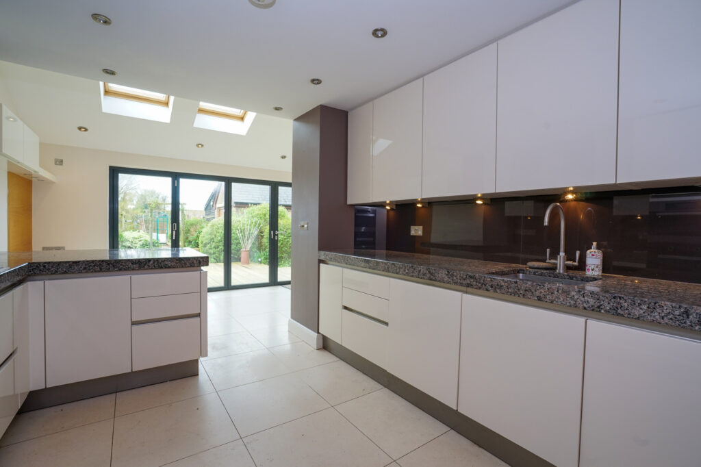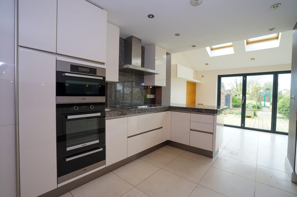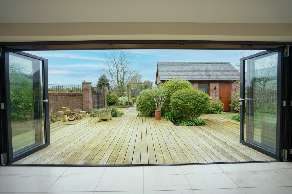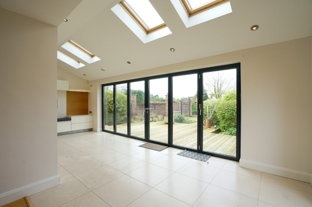 This is a very open space with a huge amount of natural being given by the Velux rooflights and the full width six metre bi fold windows. When these are open it really brings the outside in with the flush level decking leading into the garden.