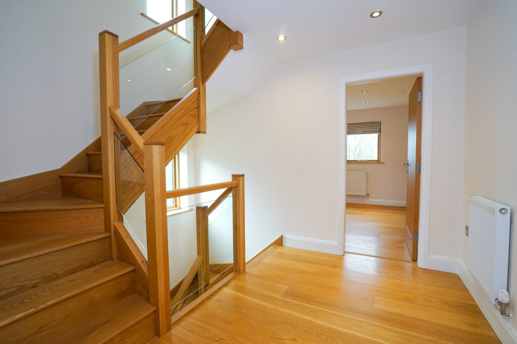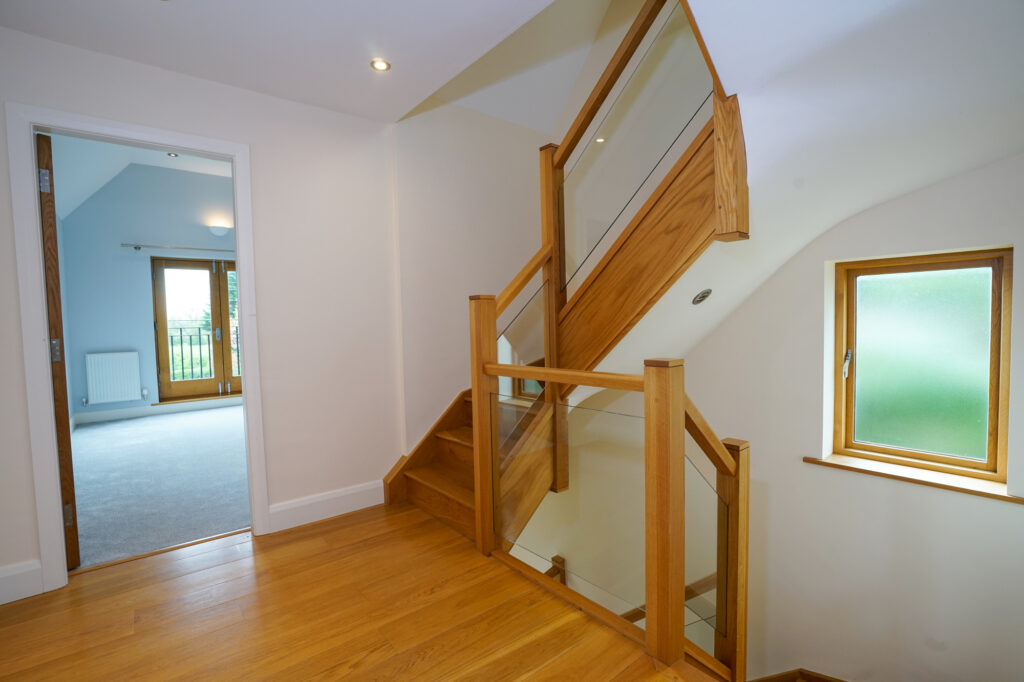 From the airy hallway to the first floor you ascend via a solid oak and glass bespoke staircase which takes you up to the first three double bedrooms. The master is of a great size with views over the fells from the oak French doors which have Juliet balcony. This leads to a generous ensuite which has views to the rear and accommodates a double shower, wc and hand basin.