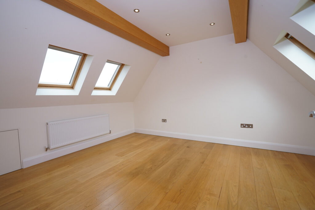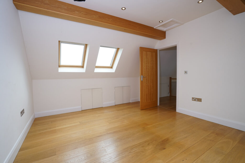 The third floor of the property accommodates double bedroom four and the family bathroom. The bedroom which is fitted with Velux windows to flood the room with light is a good size and full of character with oak clad beams.