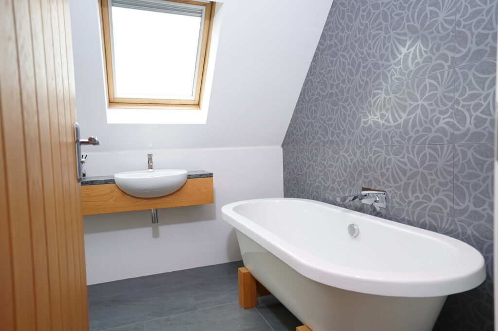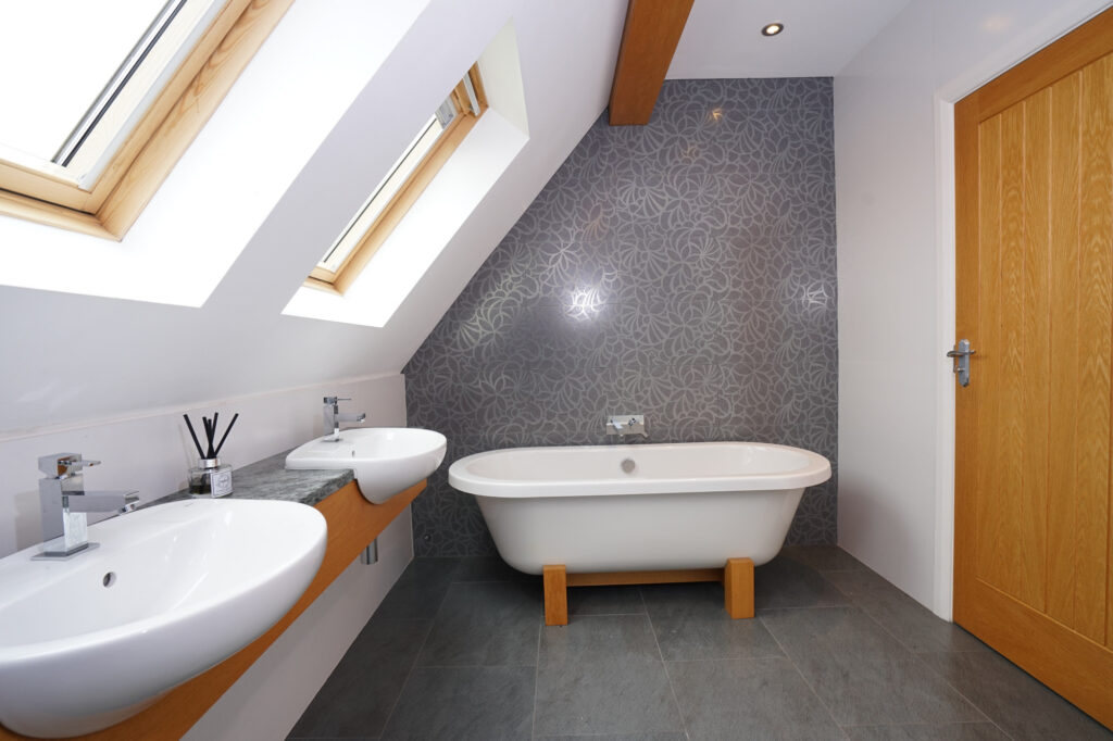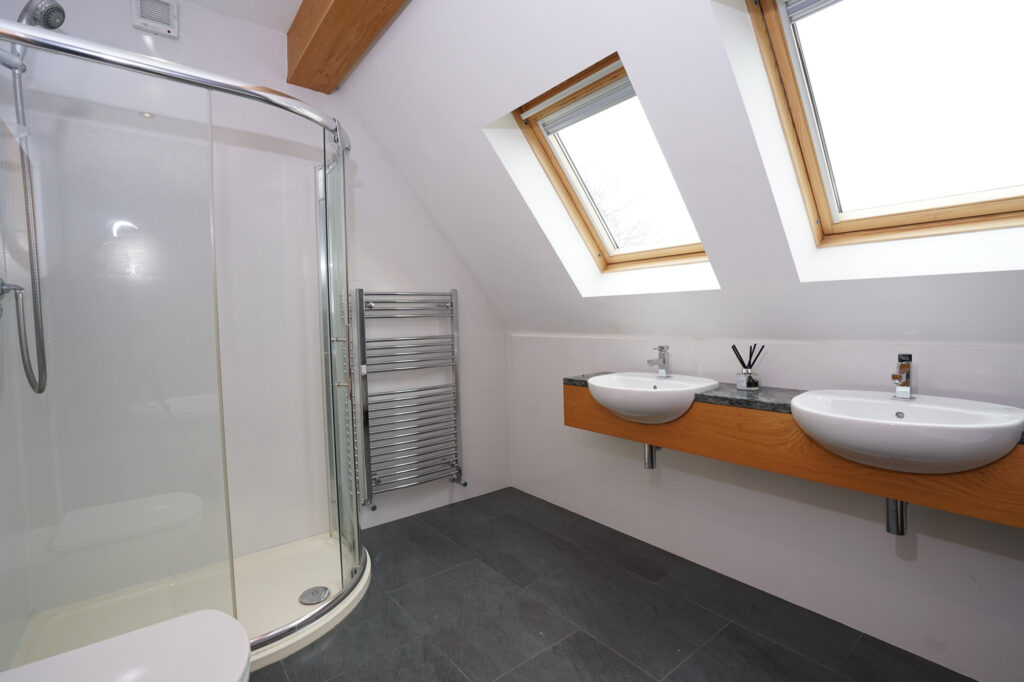 The family bathroom is a good size and accommodates a freestanding bath, large walk in shower, two hand basins and WC, this also is flooded with natural light from the above Velux rooflights.