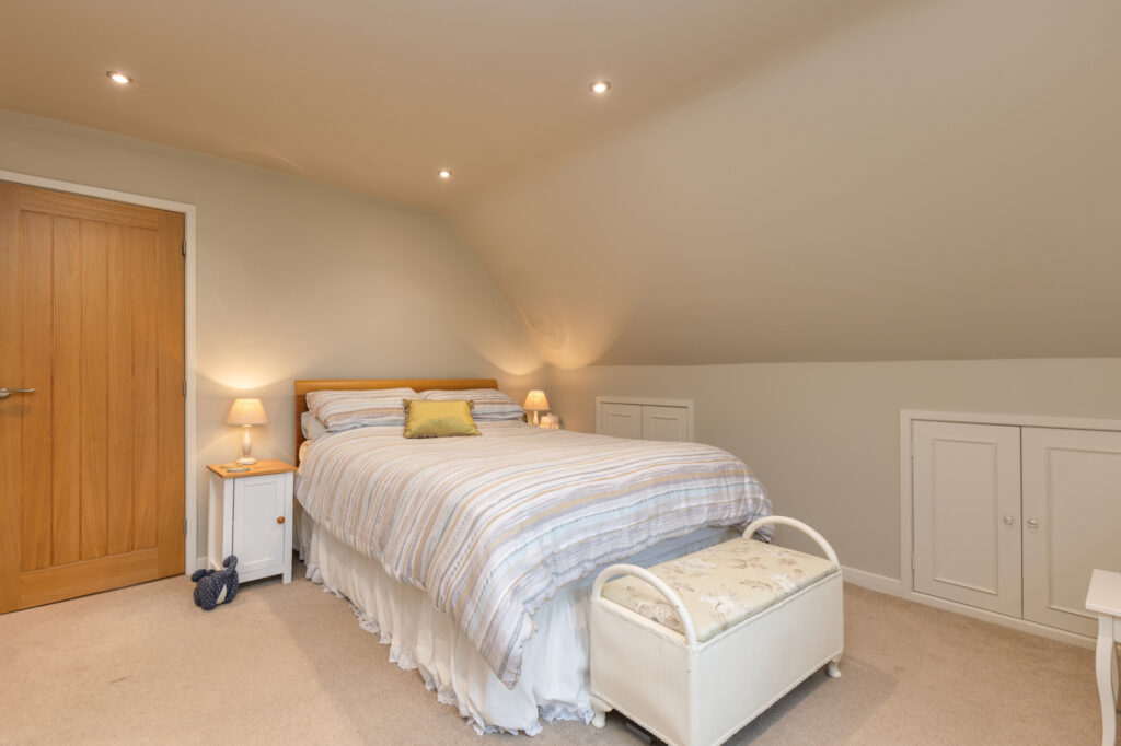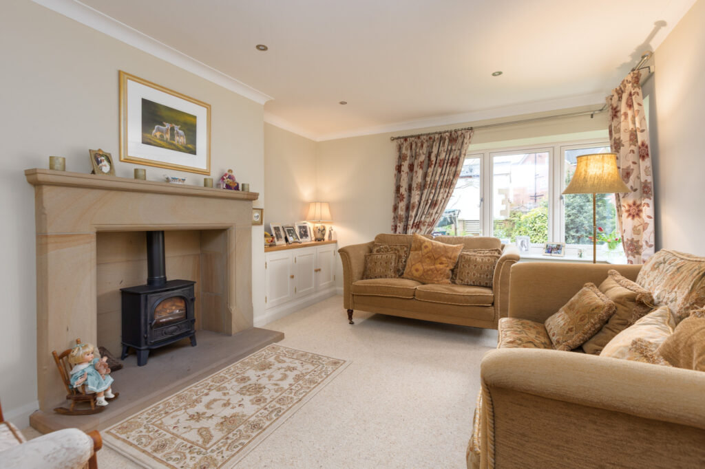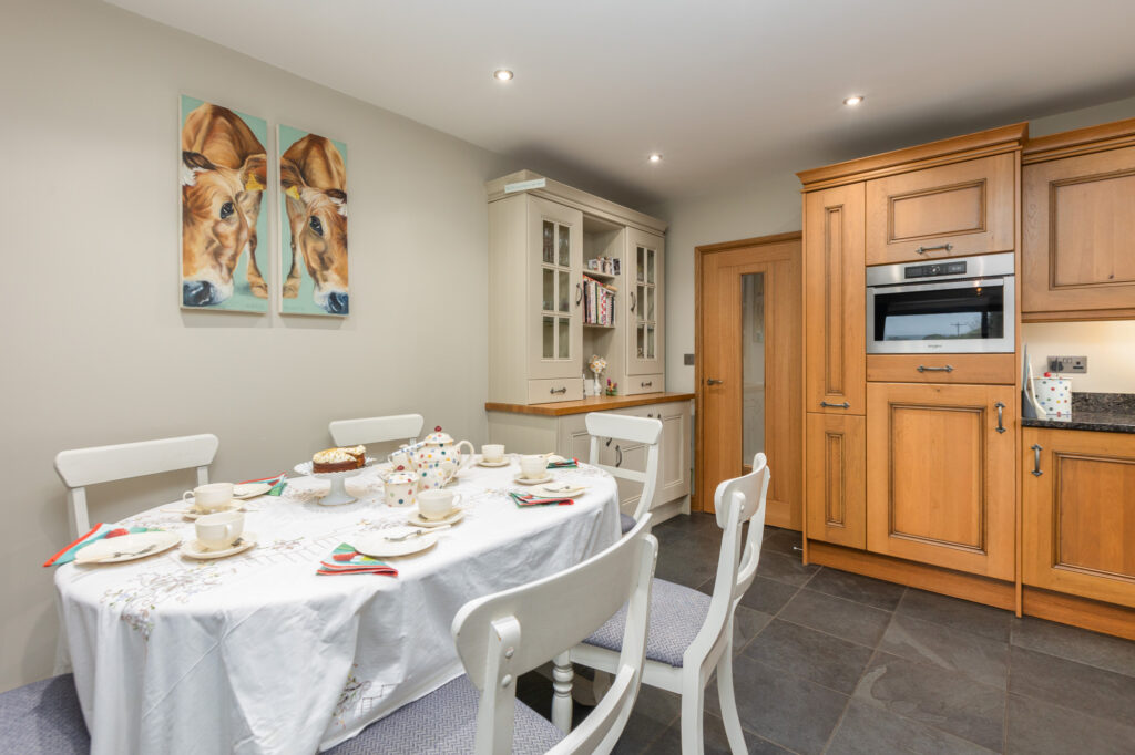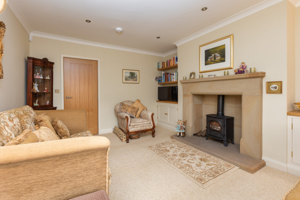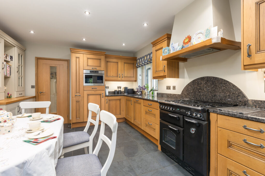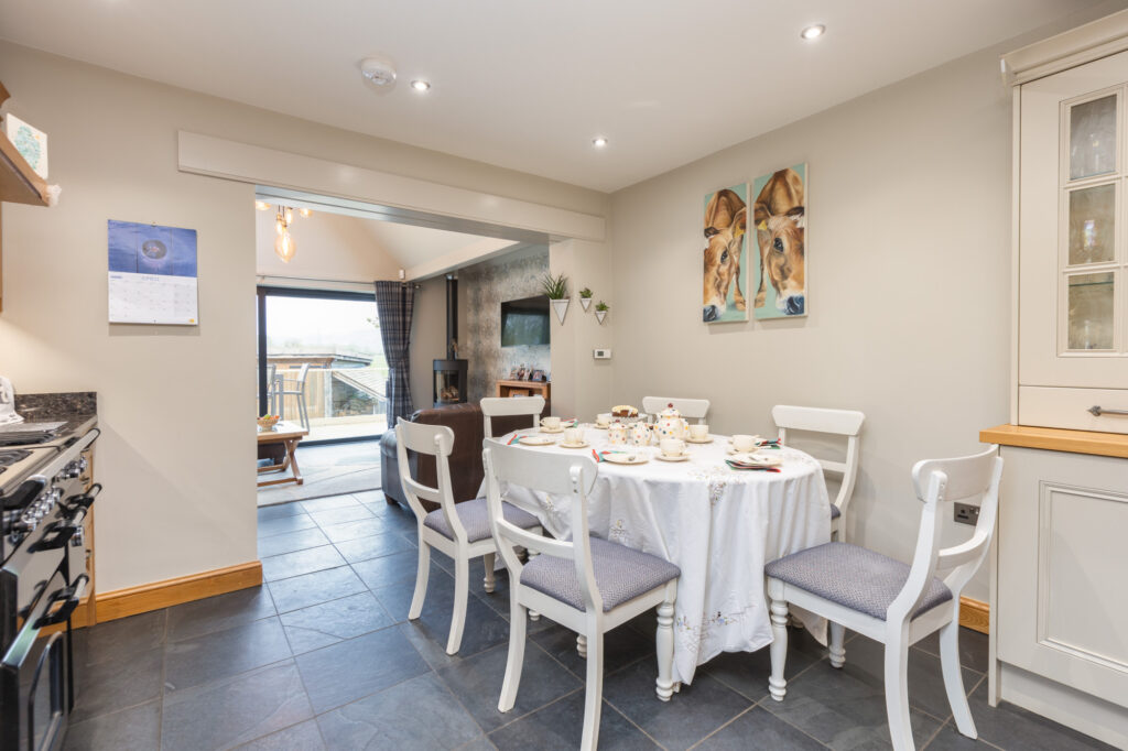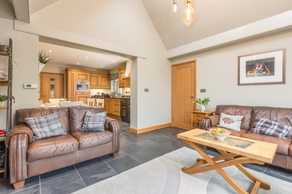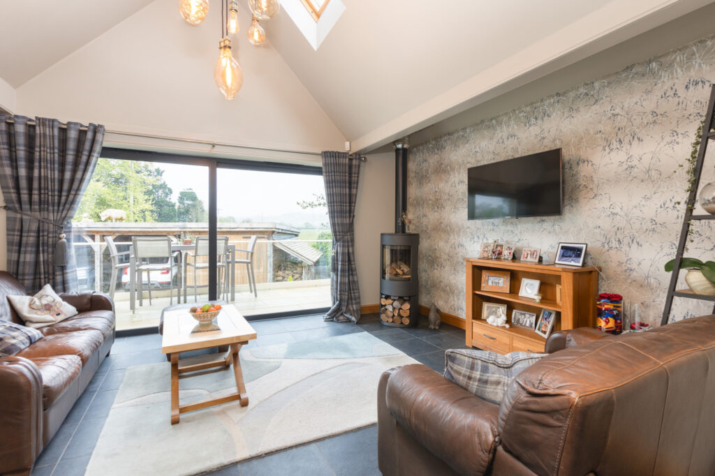 The kitchen and dining area is fully fitted with integrated appliances and a range cooker. It opens out into a living room with a log burner and sliding patio doors leading to a stone-built balcony and is ideal for hosting dinner parties or enjoying a family meal. At the front of the house, a sitting room with a log burner set into a feature stone fireplace offers a separate space for relaxing and entertaining.